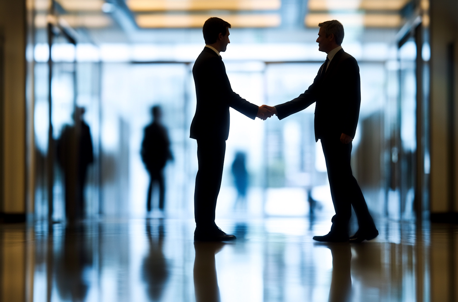 Silhouetted businessmen shaking hands in a modern office hallway, with blurred figures in the background.