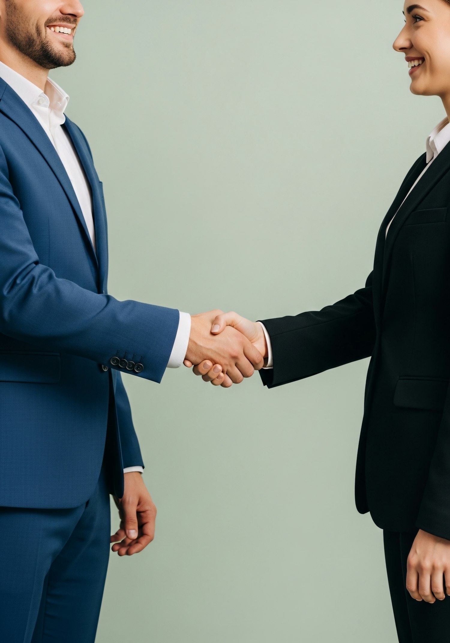 Two professionals in suits shaking hands against a light green background, symbolizing agreement or partnership.