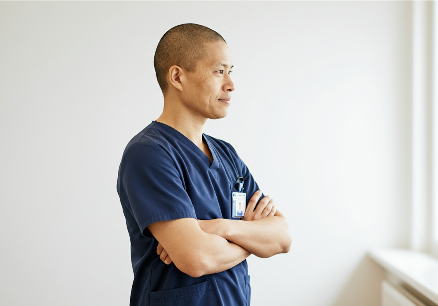 A healthcare professional in navy scrubs stands confidently with arms crossed in a bright, minimalistic setting.