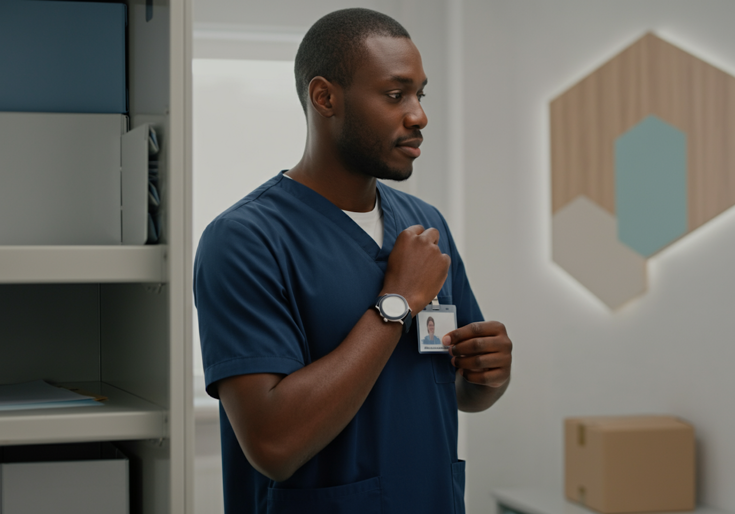 A healthcare professional in blue scrubs holding an ID badge in a modern, well-lit office setting.