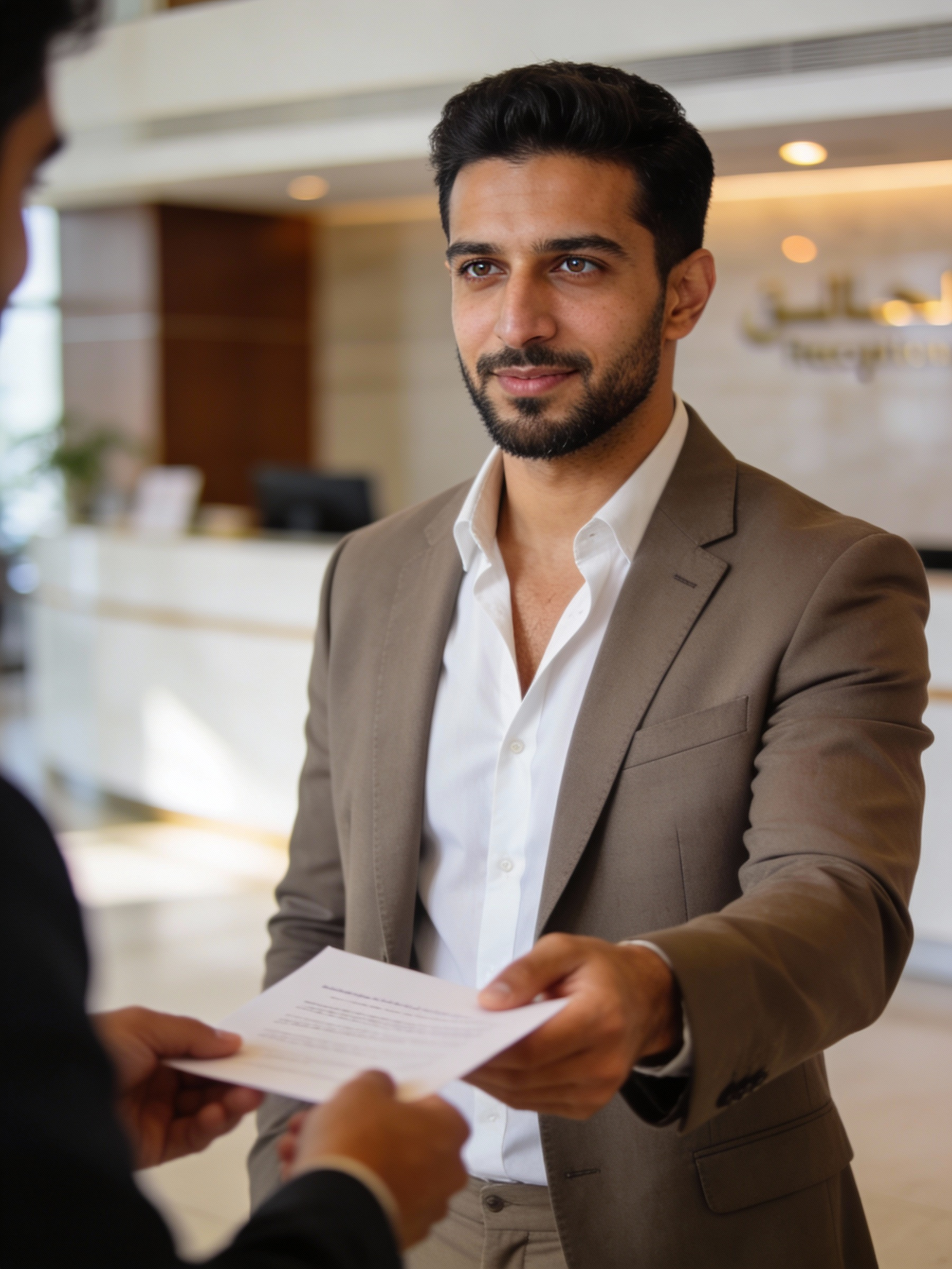 A man in a light brown suit hands a document to another person in a modern reception area, suggesting a professional interaction.