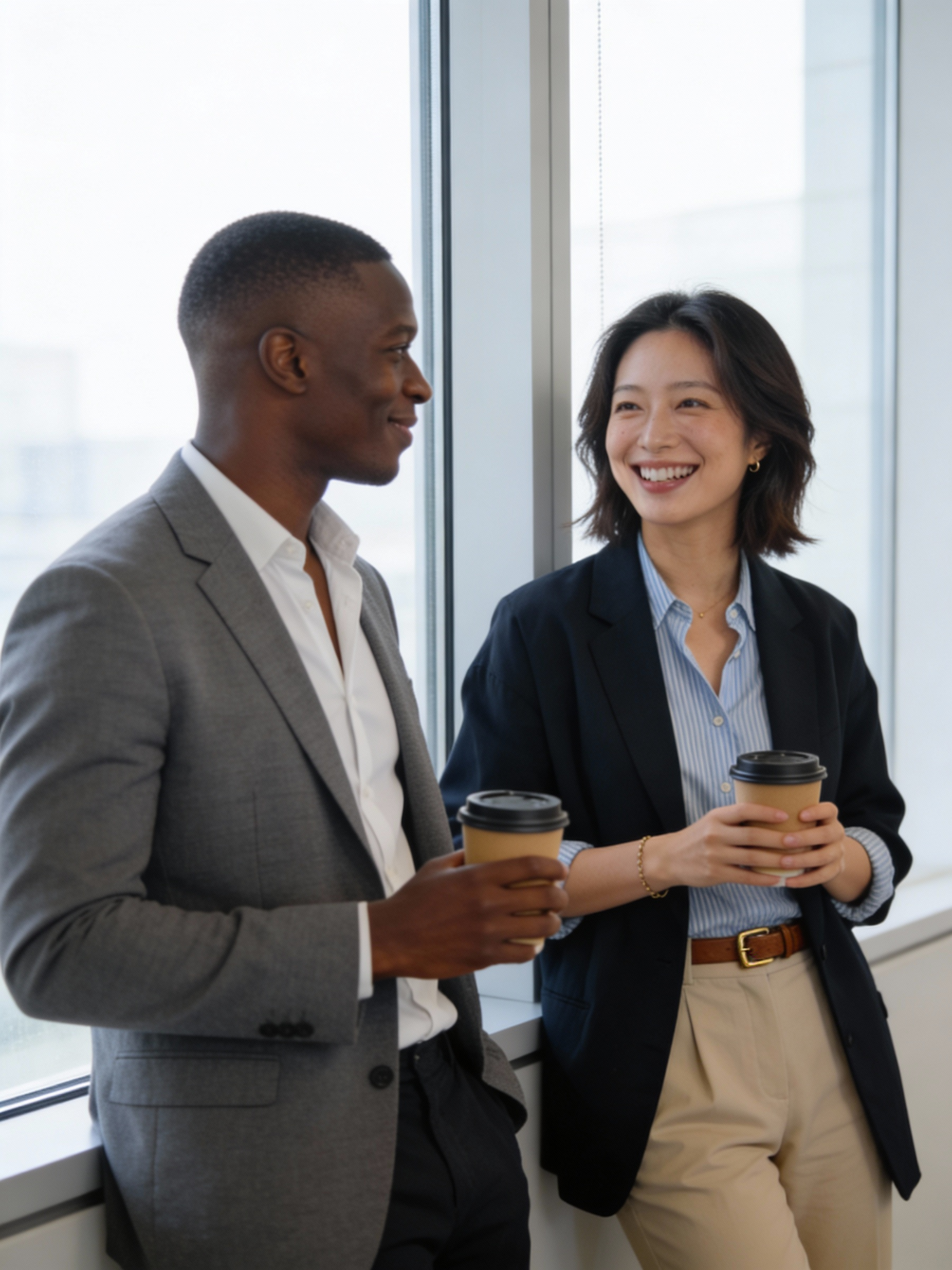 Two professionals share a friendly conversation by a window, holding coffee cups, in a bright and modern office setting.