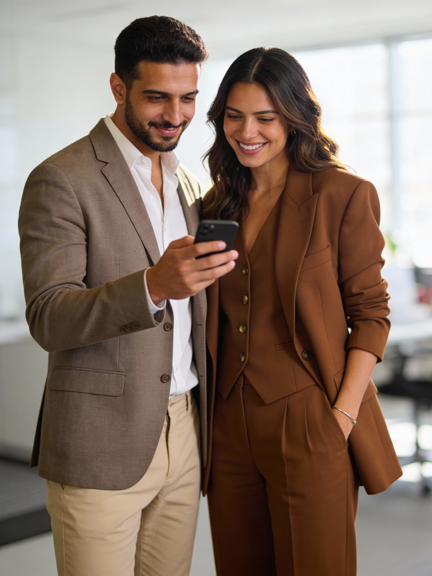 A man and woman in professional attire share a moment looking at a smartphone in a bright office setting.
