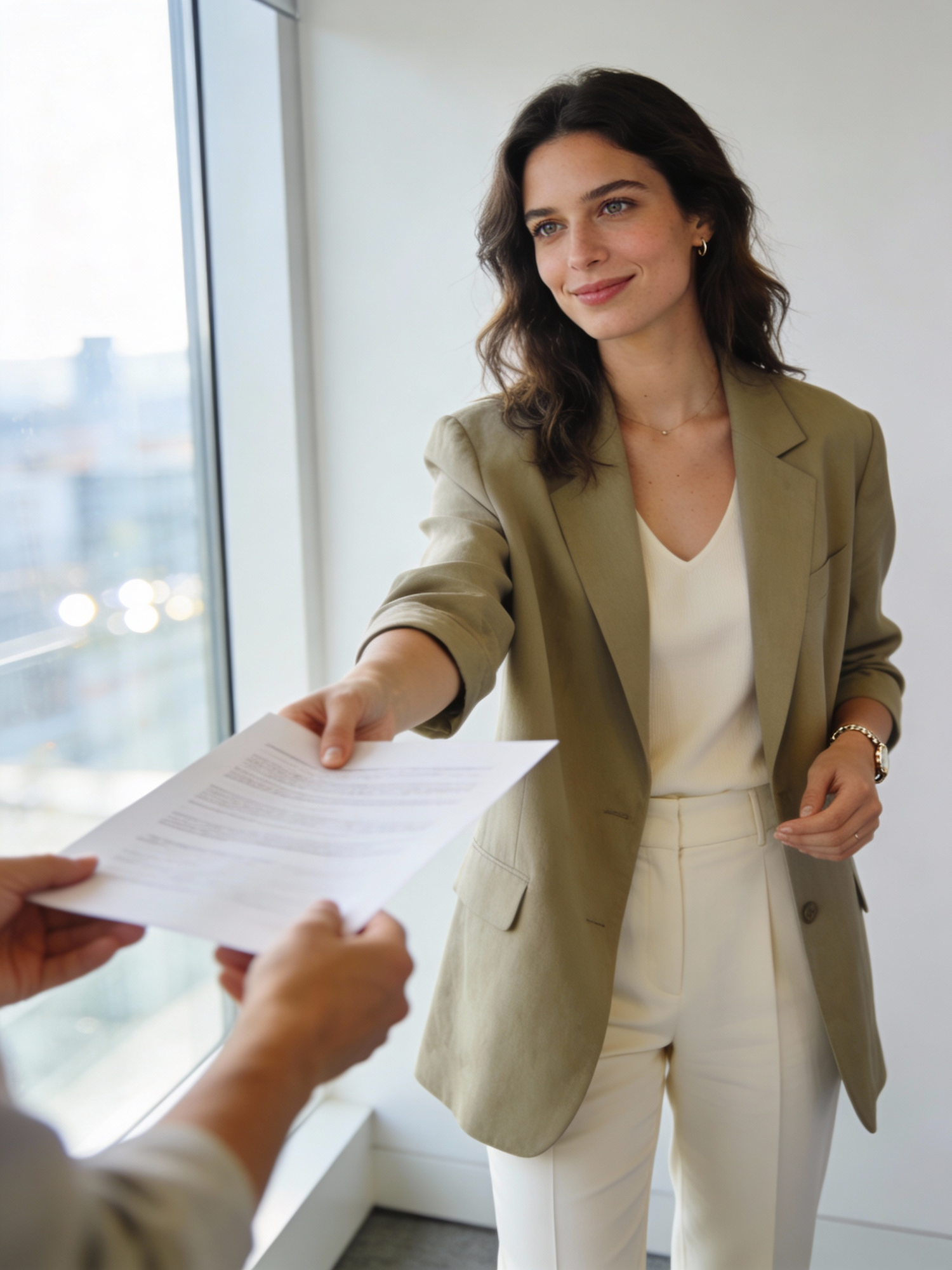 A professional woman in a beige blazer hands a document to someone in an office with a city view, exuding a collaborative atmosphere.