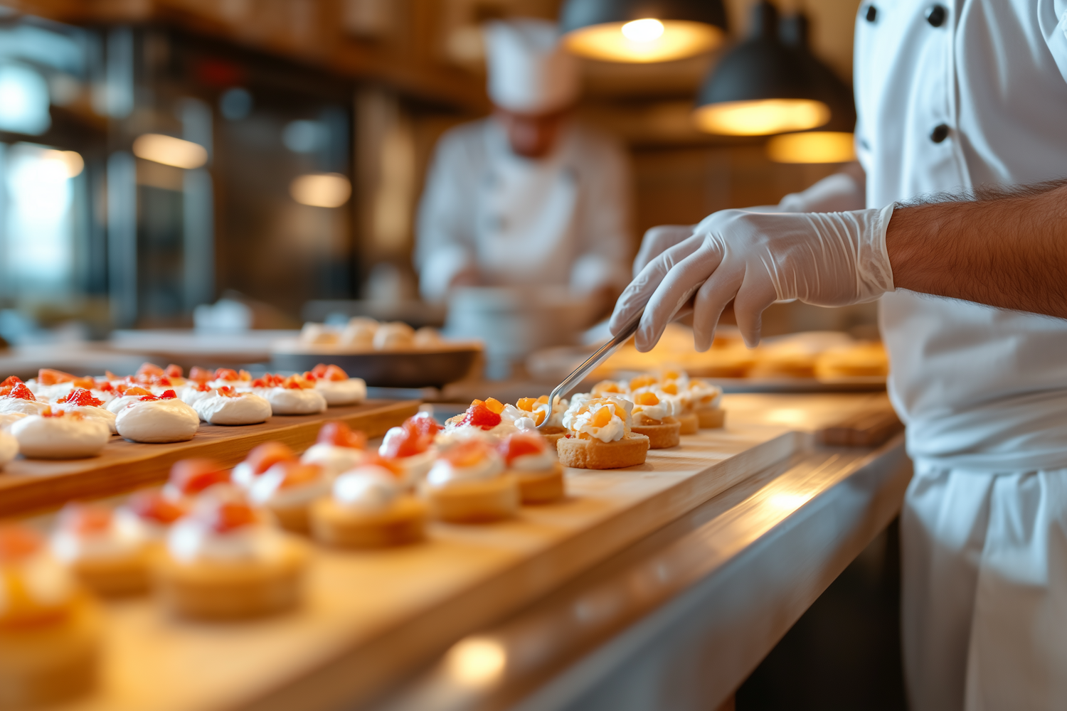 Chef decorates pastries with fruit in a warm-lit kitchen, showcasing culinary artistry and precision.