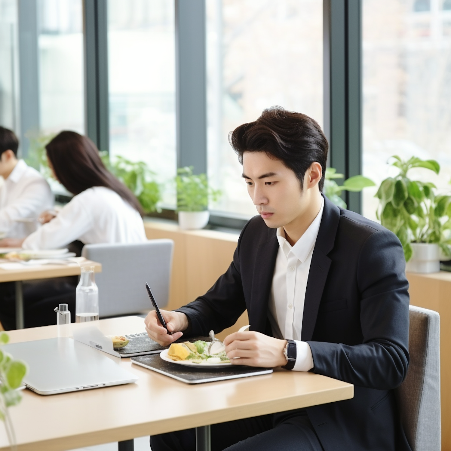 Asian man in a suit eating lunch in a modern cafeteria with natural light and greenery.