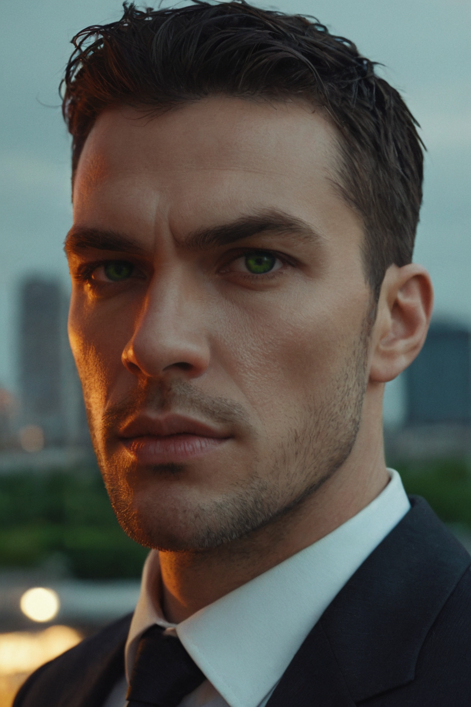 A well-dressed man with sharp features and green eyes, captured against a blurred urban background during twilight.