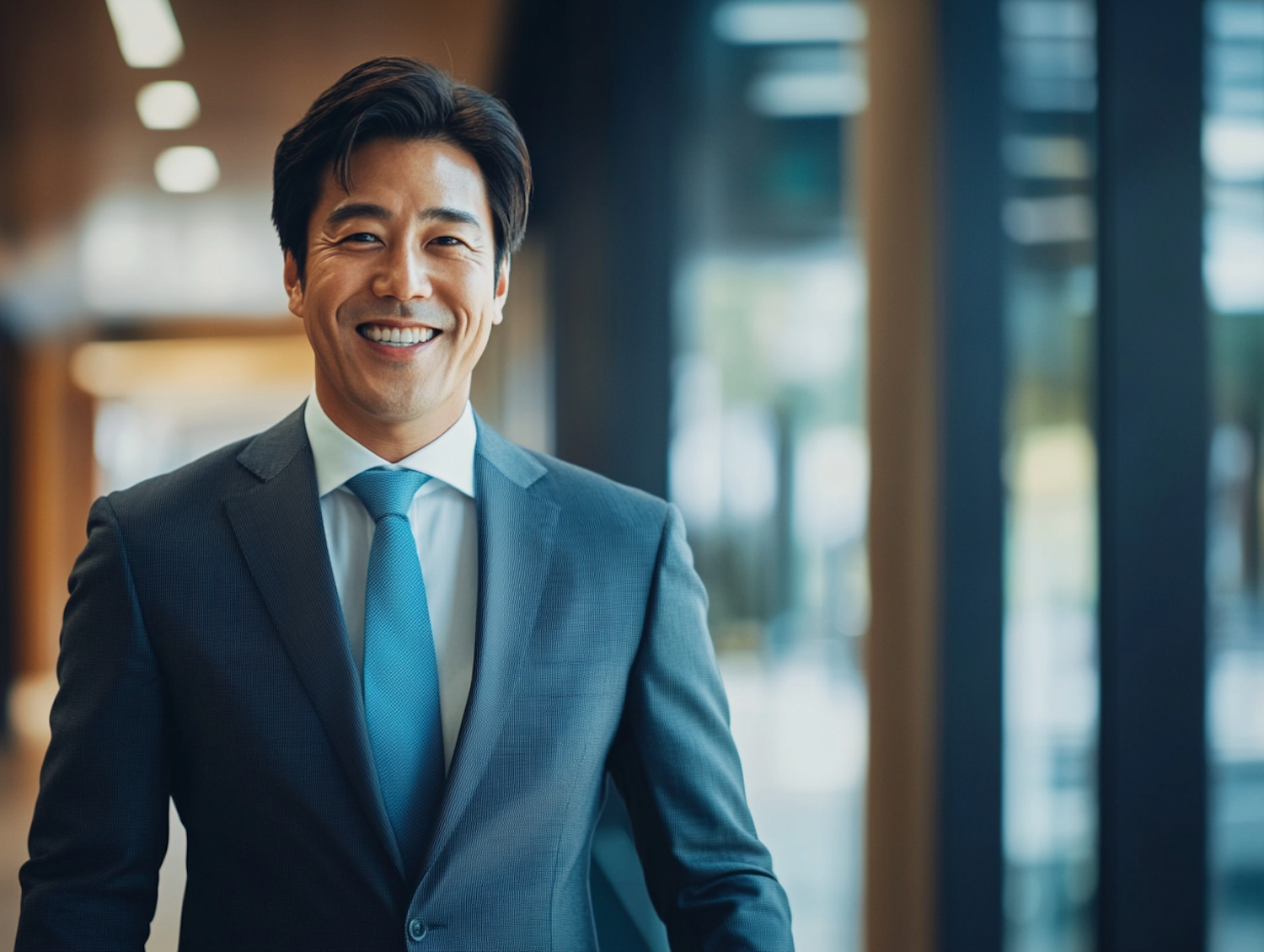Confident Asian man in a blue suit smiling in a modern office setting with natural light.