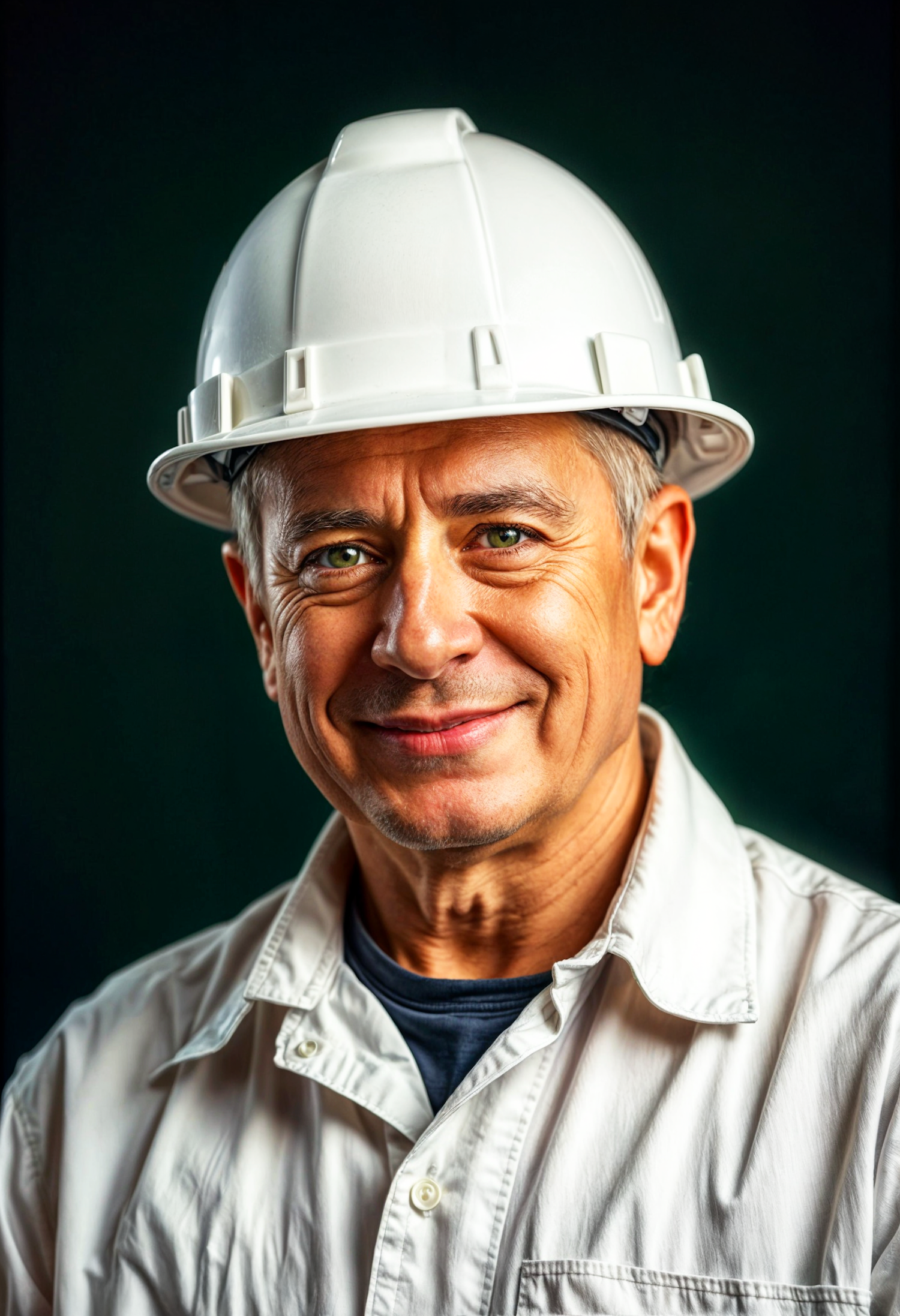 Confident middle-aged man in a white hard hat and shirt, smiling warmly against a dark green background. Professional and approachable.