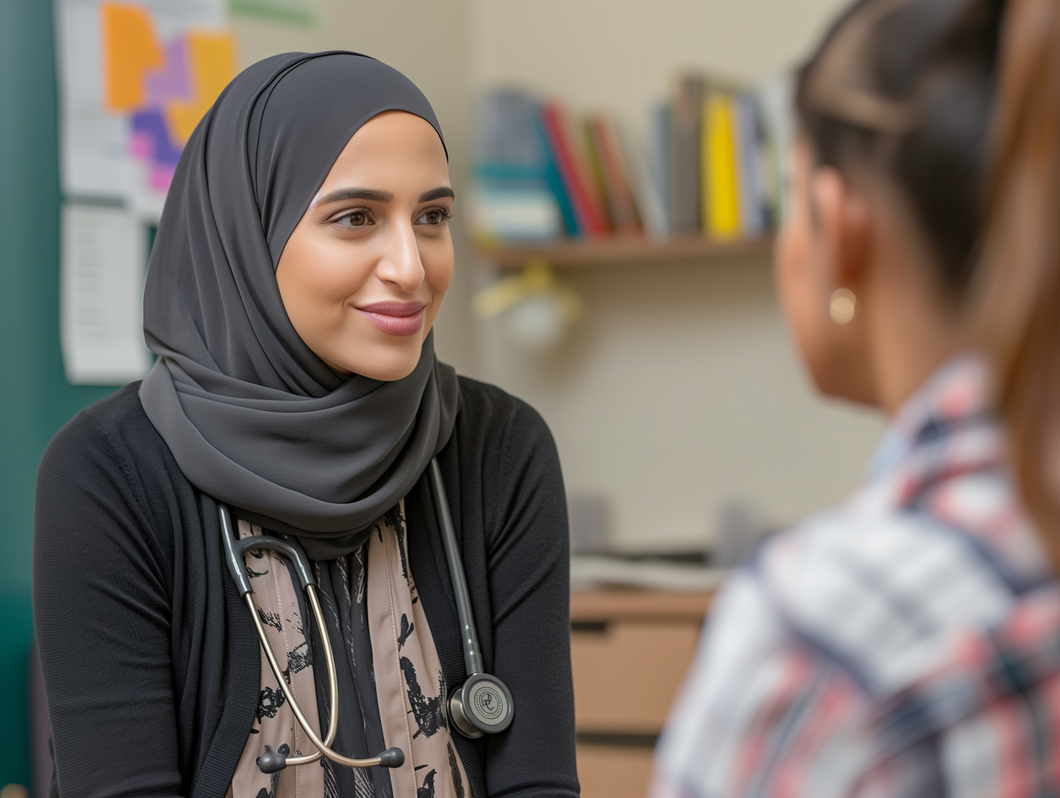 A healthcare professional in a gray hijab attentively listens to a patient in a clinic setting, fostering a warm and caring atmosphere.