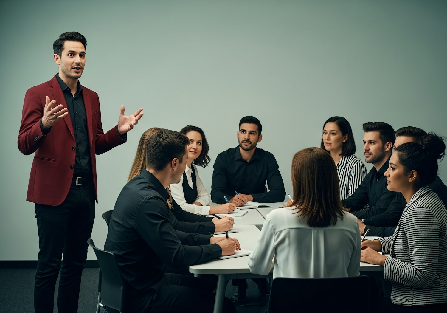 A professional team in a meeting, with a presenter in a red blazer leading the discussion, fostering collaboration and engagement.