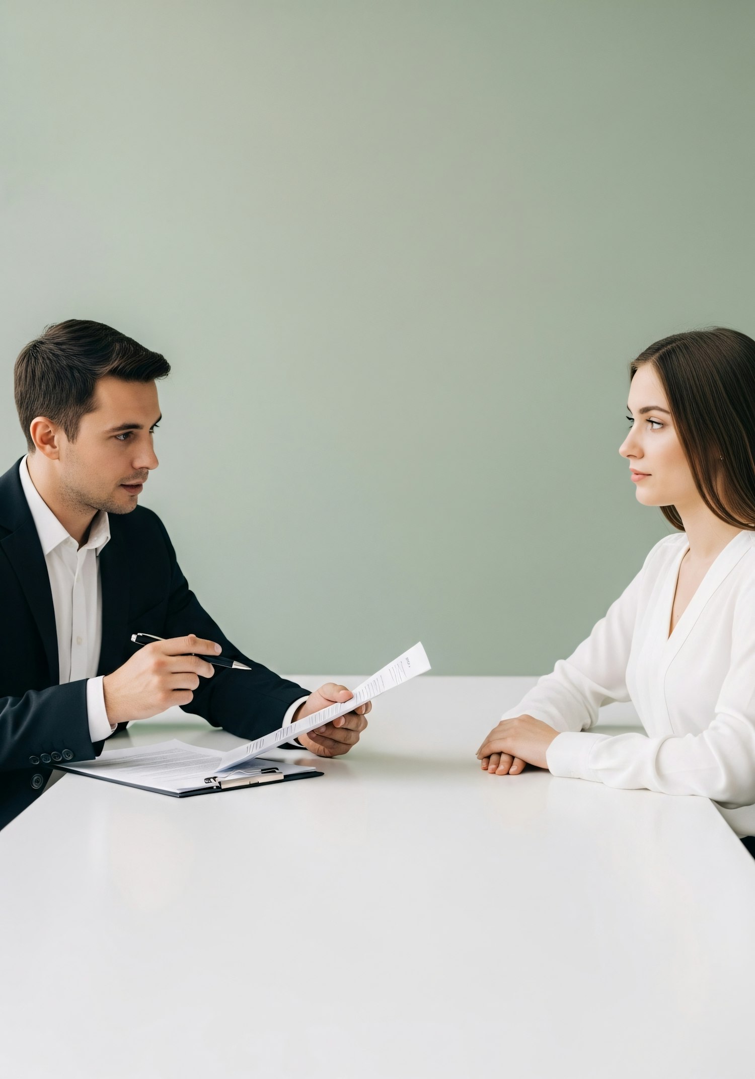 A professional meeting scene with a man and woman discussing documents at a white table against a light green background.