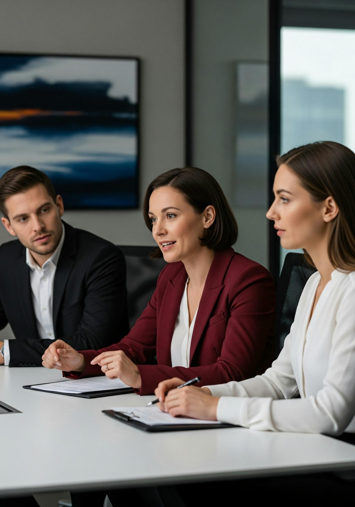 Three professionals in a meeting, discussing ideas in a modern office setting, with a focus on collaboration and engagement.