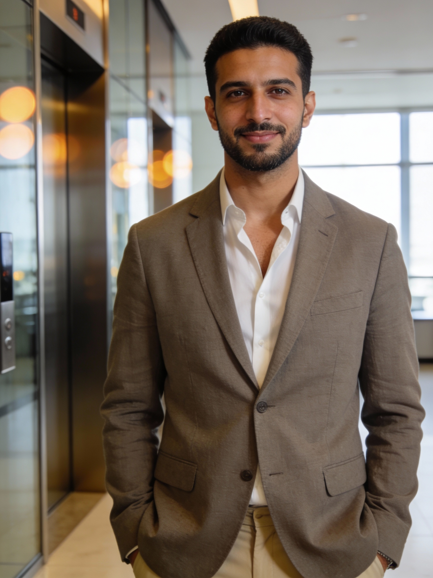 Ultra-realistic professional portrait of a confident Emirati man, mid 30s, friendly calm expression, direct eye contact. Outfit: taupe sport blazer (relaxed fit) over an open-collar white shirt, tailored beige trousers implied. Hair: short neatly styled; grooming: neatly trimmed short beard. Framing: half-body waist-up, centered, eye-level. Background: modern office elevator lobby with glass reflections and warm bokeh highlights, strongly blurred. Lighting: soft window daylight + gentle fill, clean catchlights, subtle rim light, premium corporate/editorial retouch, natural skin texture. 85mm look, shallow depth of field, clean neutral slightly warm color grade, high-end corporate photography, no text, no logos, no watermark.