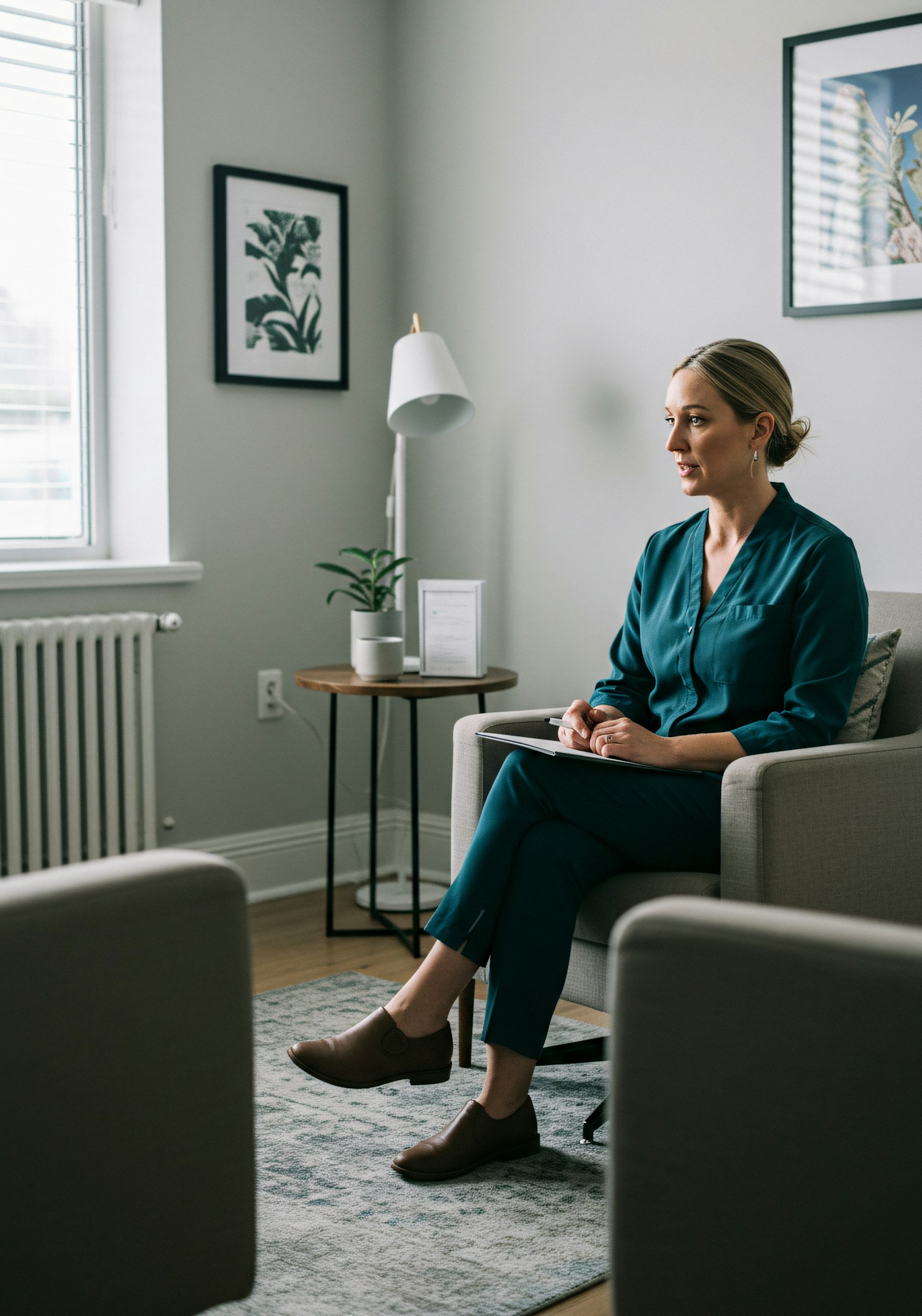 A professional woman in a teal outfit sits in a modern office, holding a clipboard, with a calm and focused demeanor.