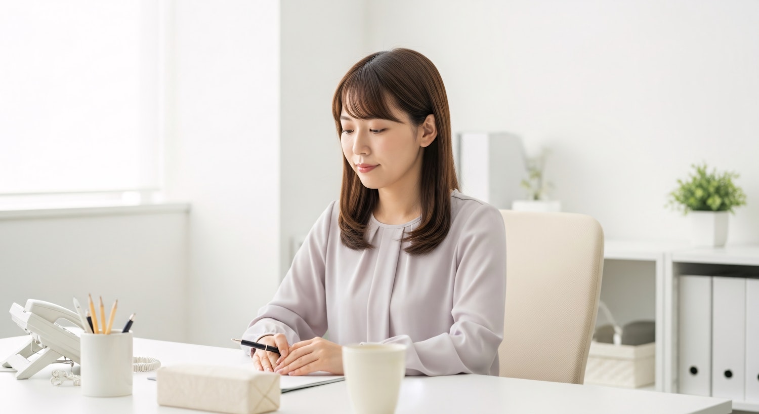 A professional woman in a minimalist office setting, seated at a white desk with organized items, exuding focus and calmness.
