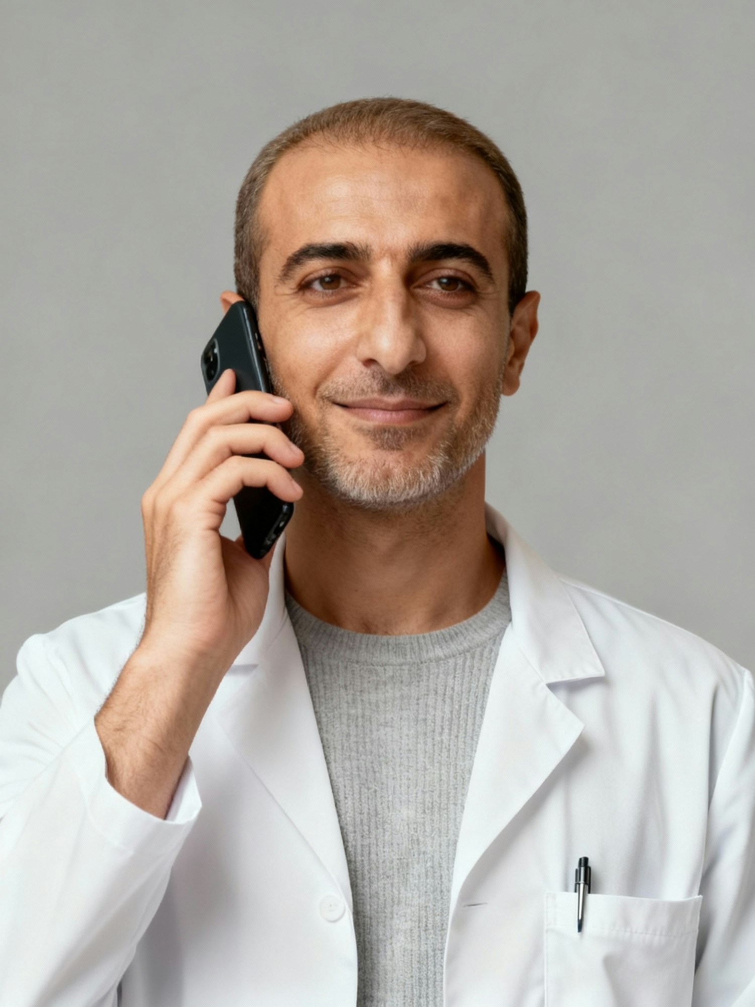 A professional man in a white lab coat talks on the phone, exuding confidence and approachability in a neutral setting.