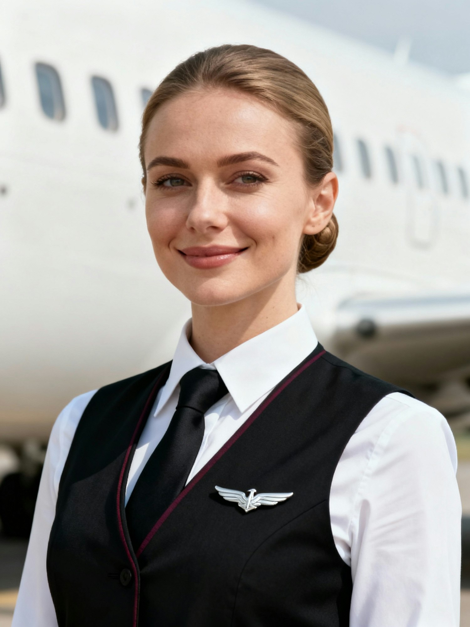 Outdoor airport portrait of a Polish woman cabin crew, 30; fair skin (neutral); elegant low chignon; white shirt with a black vest featuring subtle burgundy piping, matte black tie; small silver wing pin (no logo). Pose: head upright (0–2° roll), chin parallel to floor, shoulders level and squared; eyes to camera; welcoming smile. Framing: head-and-shoulders (not tight), full head visible with 8–12% headroom; crop at upper chest; centered; 3:4 vertical. Background: “blurred commercial airliner fuselage with window line, no logos or tail numbers, same angle and distance.” Lighting: soft open-shade daylight. Lens/Optics: 105 mm at ~f/2.8 for shallow depth and softness; macro-sharp on eyes; neutral WB; exposure matched. Uniform rule: white shirt, black vest with burgundy piping, matte black tie (no hats, no scarves). Negative: Dutch angle, head tilt, epaulettes/stripes, readable branding, HDR/glam retouch.