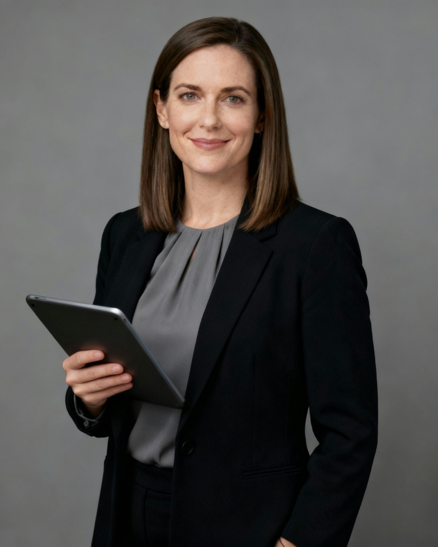 Professional woman in a black blazer holding a tablet, set against a neutral gray background, exuding confidence and professionalism.