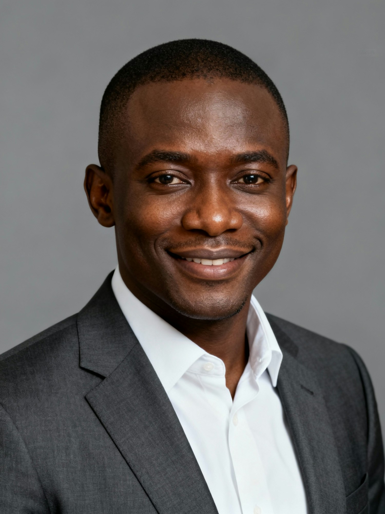 Studio portrait of a Ghanaian male lawyer, age 35; deep-brown skin, warm undertone; short fade haircut, clean-shaven face; charcoal suit and white shirt (non-branded); neutral mid-gray seamless backdrop; clamshell lighting with balanced key + rim; 105 mm macro-sharp; photorealistic, editorial. Expression: charismatic confidence with subtle half-smile. Skin: natural, healthy sheen. Negative: over-retouch, logos, watermarks.