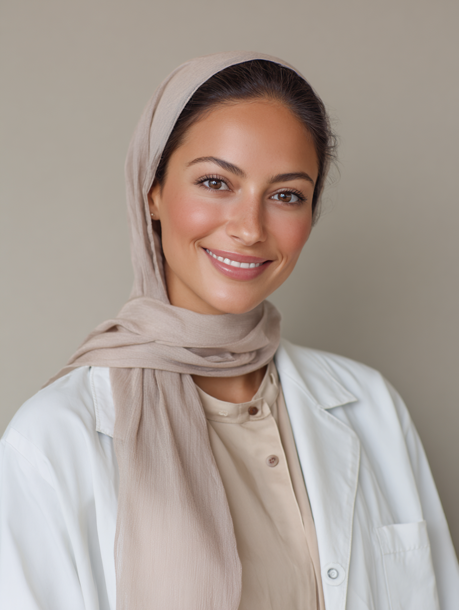 A professional woman in a beige headscarf and white lab coat smiles warmly, set against a neutral background.