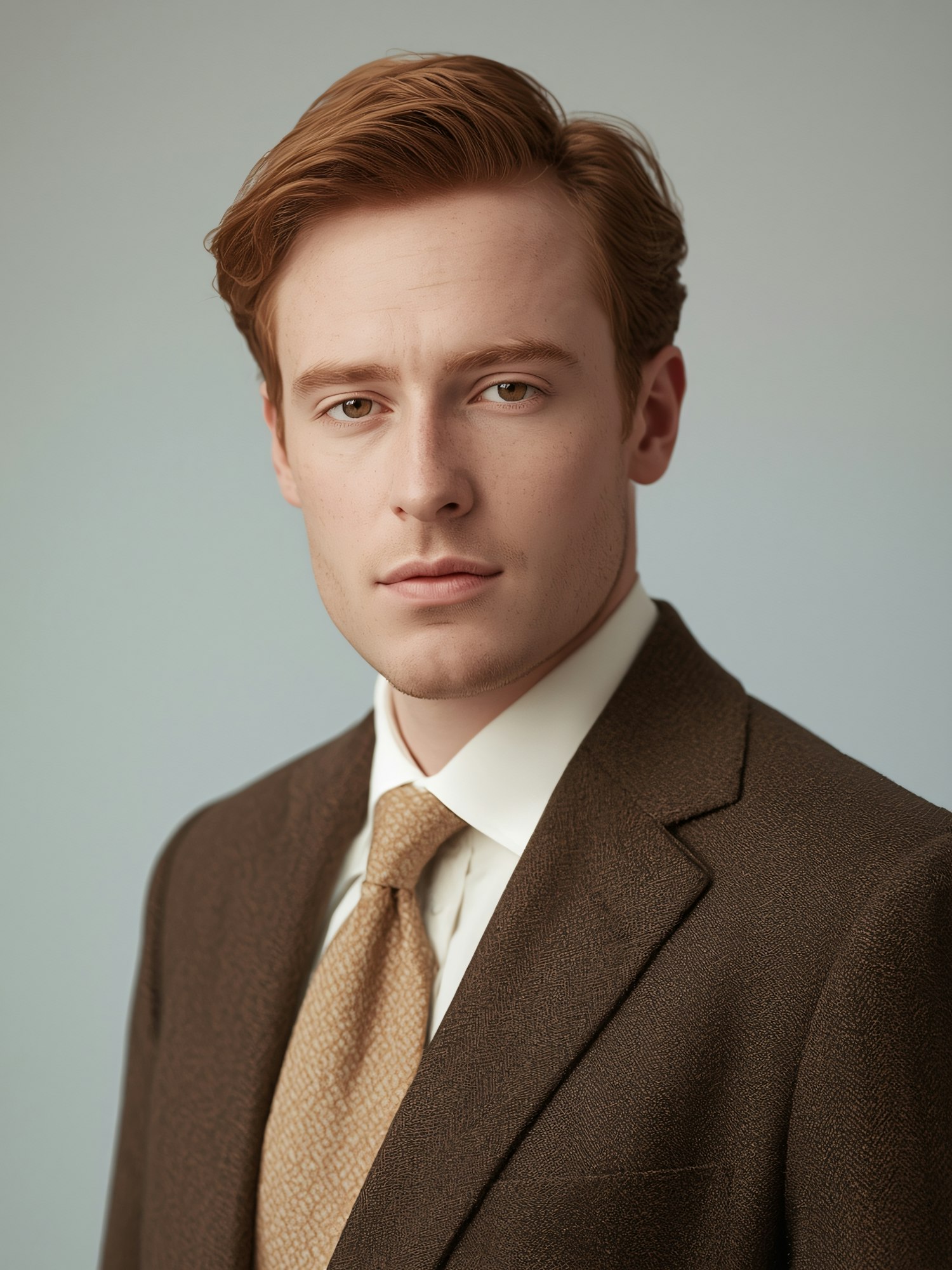 A professional portrait of a young man in a brown suit, white shirt, and beige tie, set against a soft gradient background.
