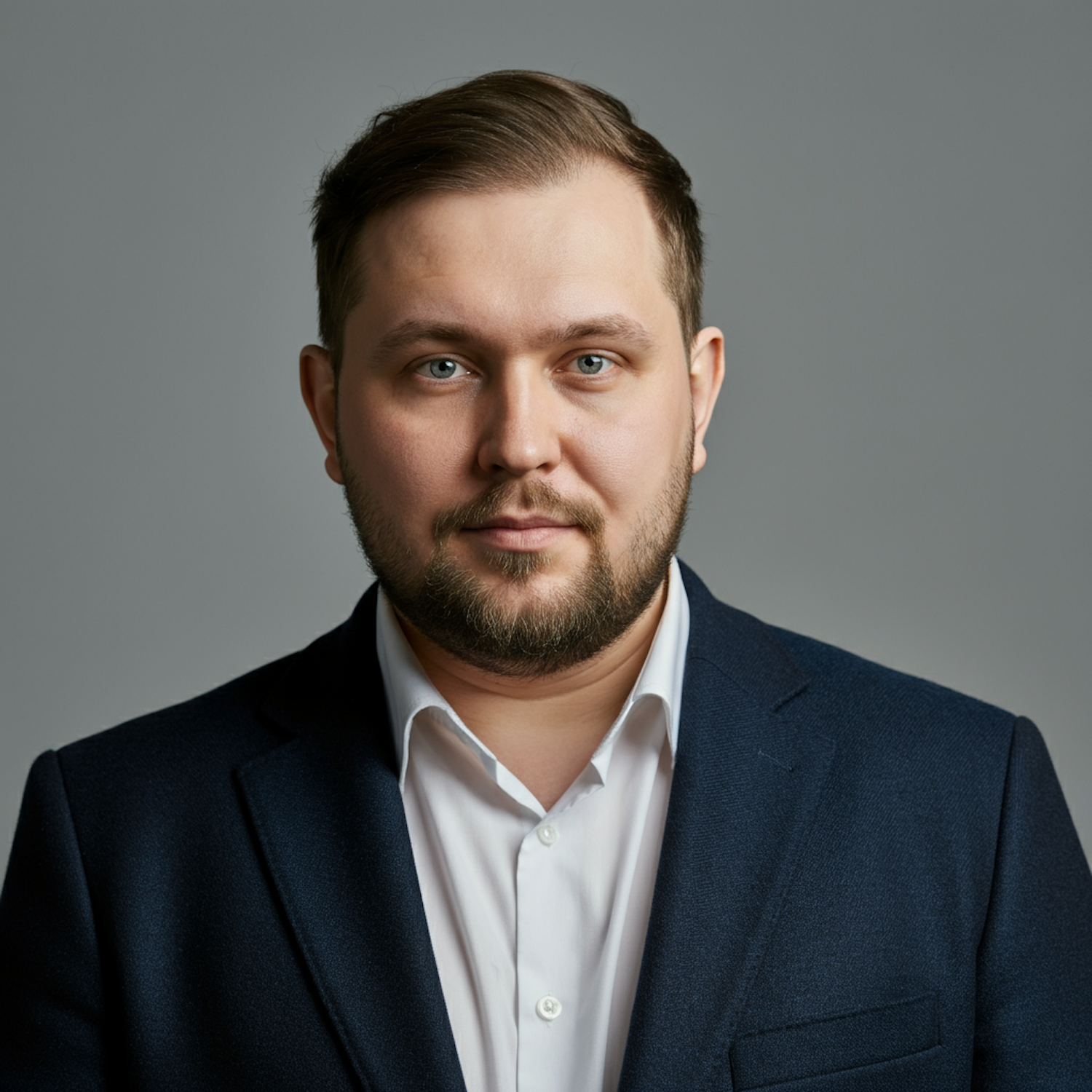Professional portrait of a man in a navy suit and white shirt, with a neutral gray background, showcasing a formal and polished look.