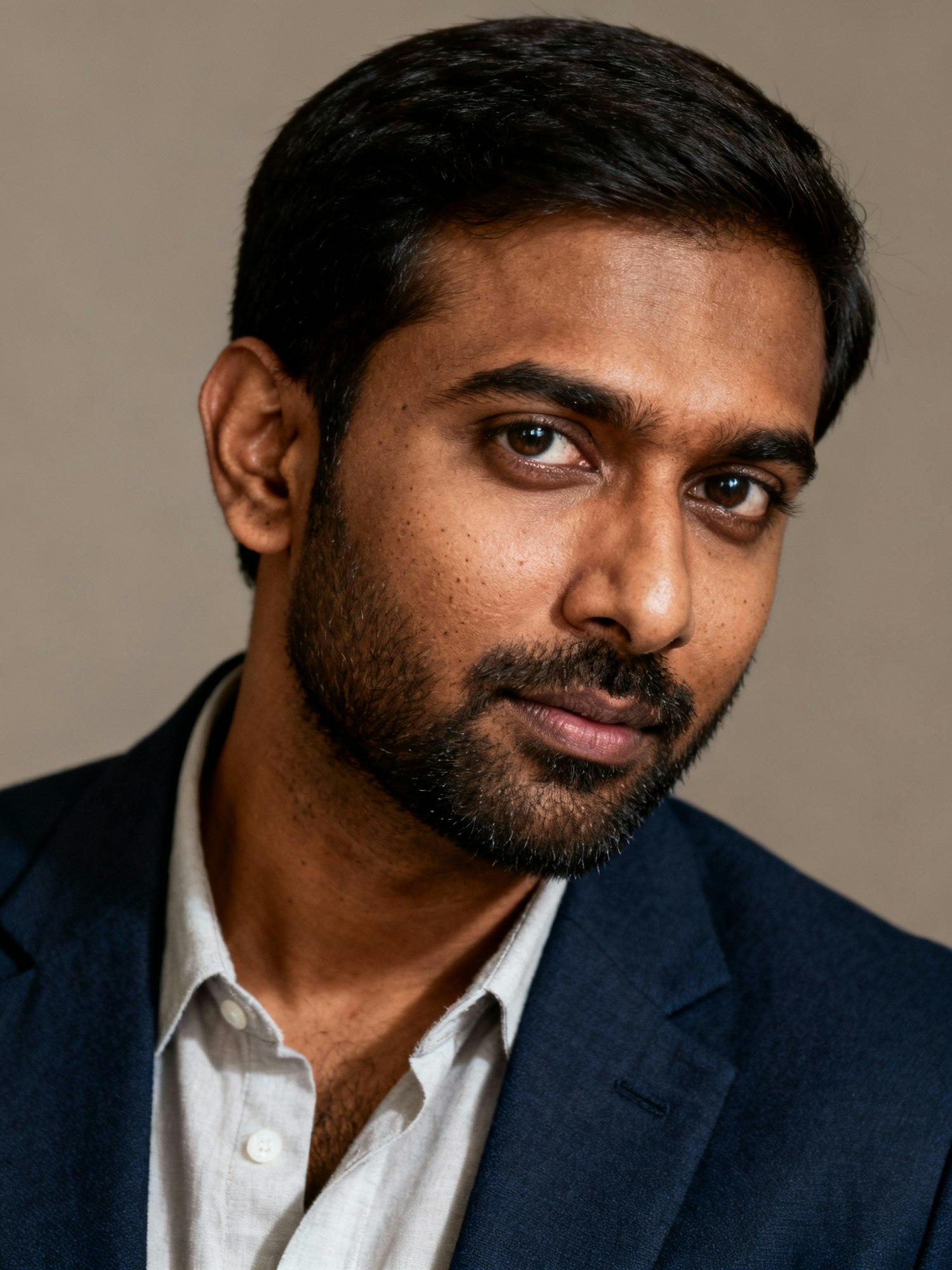 Studio portrait of an Indian man machine-learning engineer in his mid-thirties; medium brown skin (warm); short neat hair, trimmed beard; navy blazer over light shirt; three-quarter pose (20° camera-right), eyes to camera; tight head-and-shoulders close-up; neutral seamless backdrop; Rembrandt lighting; 105mm macro-sharp detail; photorealistic, editorial. Expression: thoughtful focus. Negative: “youthifying” skin blur, exaggerated wrinkle removal.