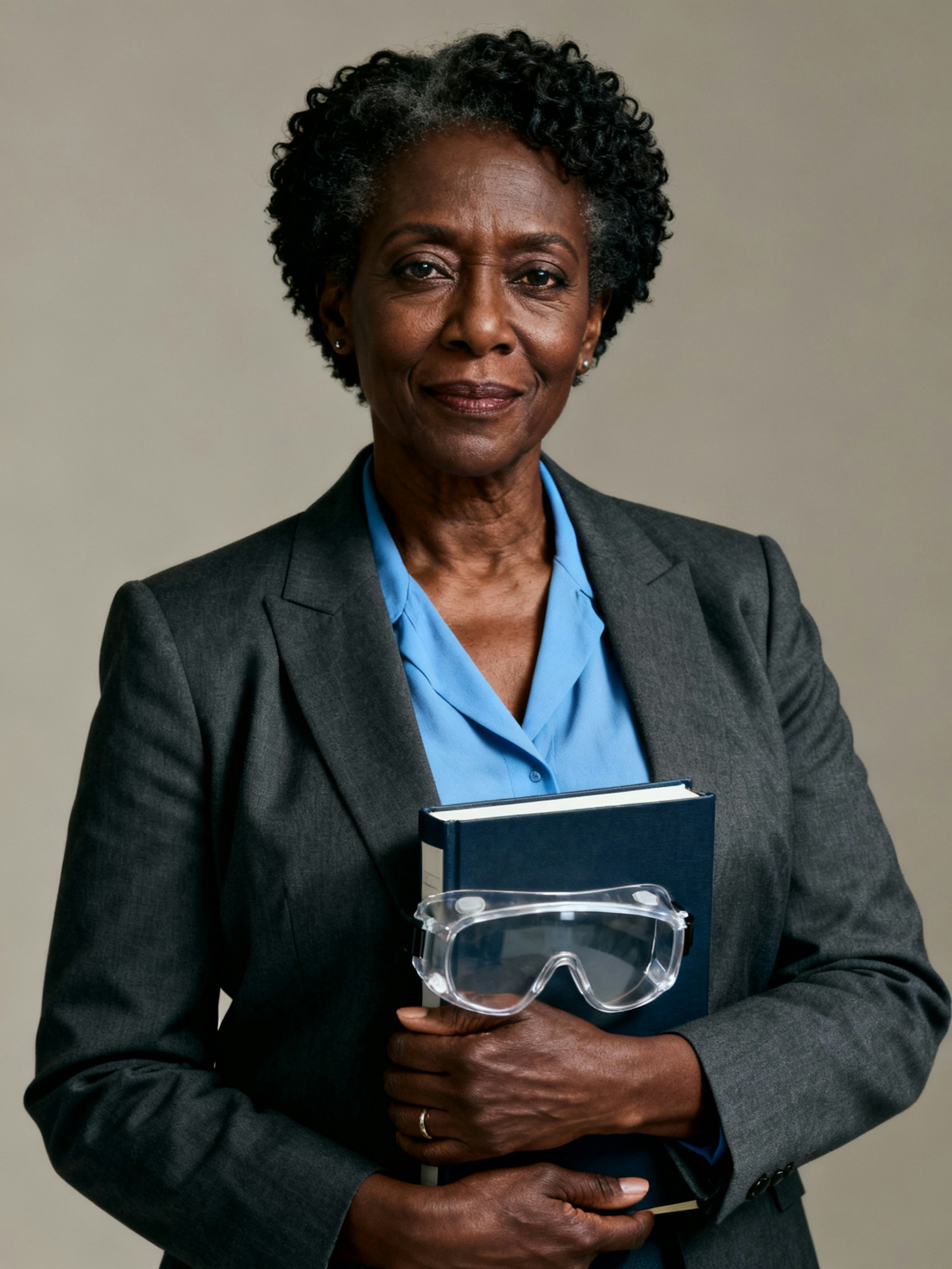 A professional woman in a blazer holds a book with safety goggles, exuding expertise and confidence in a neutral setting.