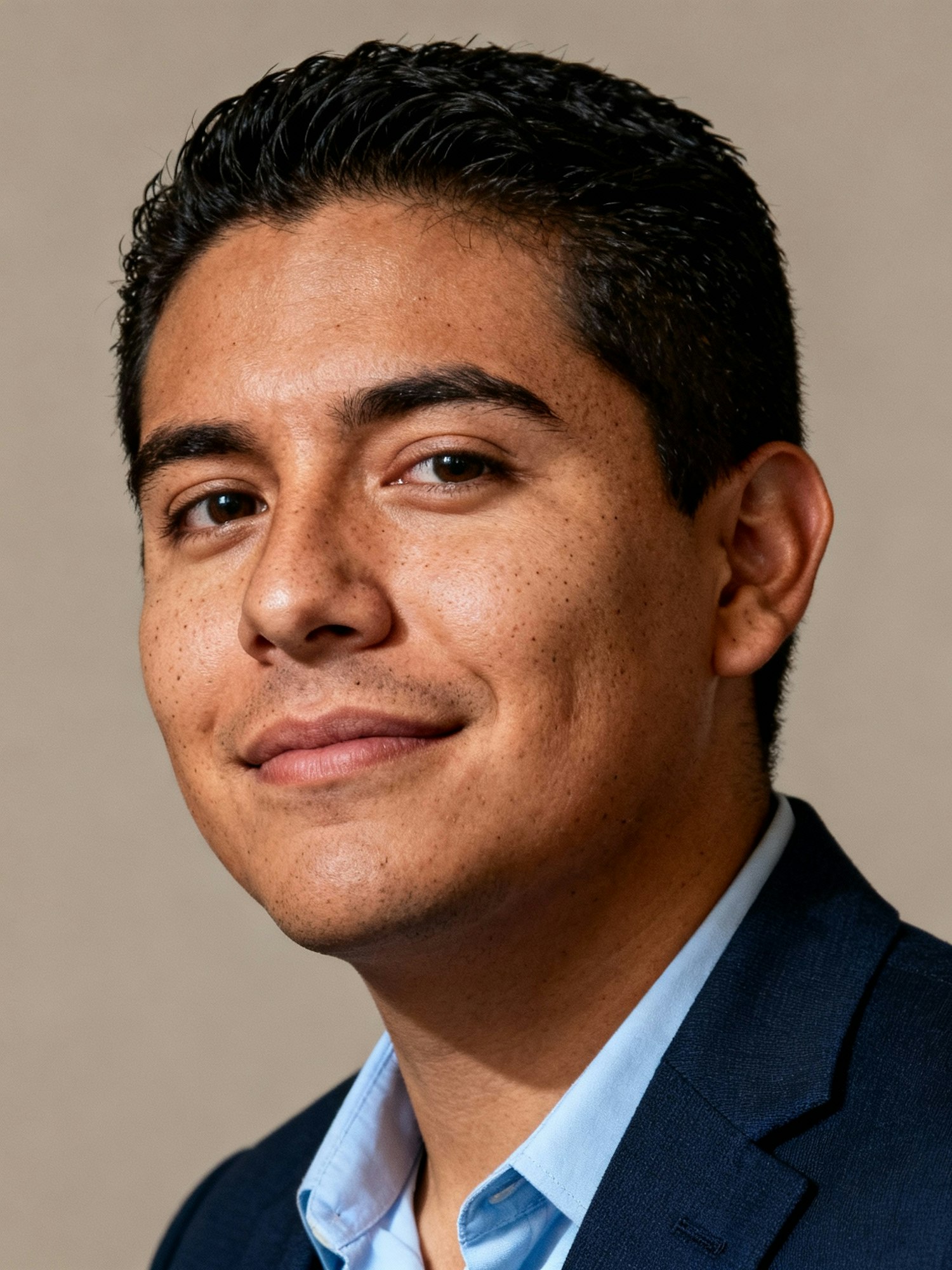 Studio portrait of a Mexican man DevOps lead in his late twenties; medium skin (warm); short textured hair; navy blazer, light-blue shirt; three-quarter head-and-shoulders (~10° off-axis), eyes to camera; tight head-and-shoulders close-up; neutral seamless backdrop; Rembrandt lighting; 105mm macro-sharp detail; photorealistic, editorial. Expression: friendly determination. Negative: “youthifying” skin blur, exaggerated wrinkle removal.
