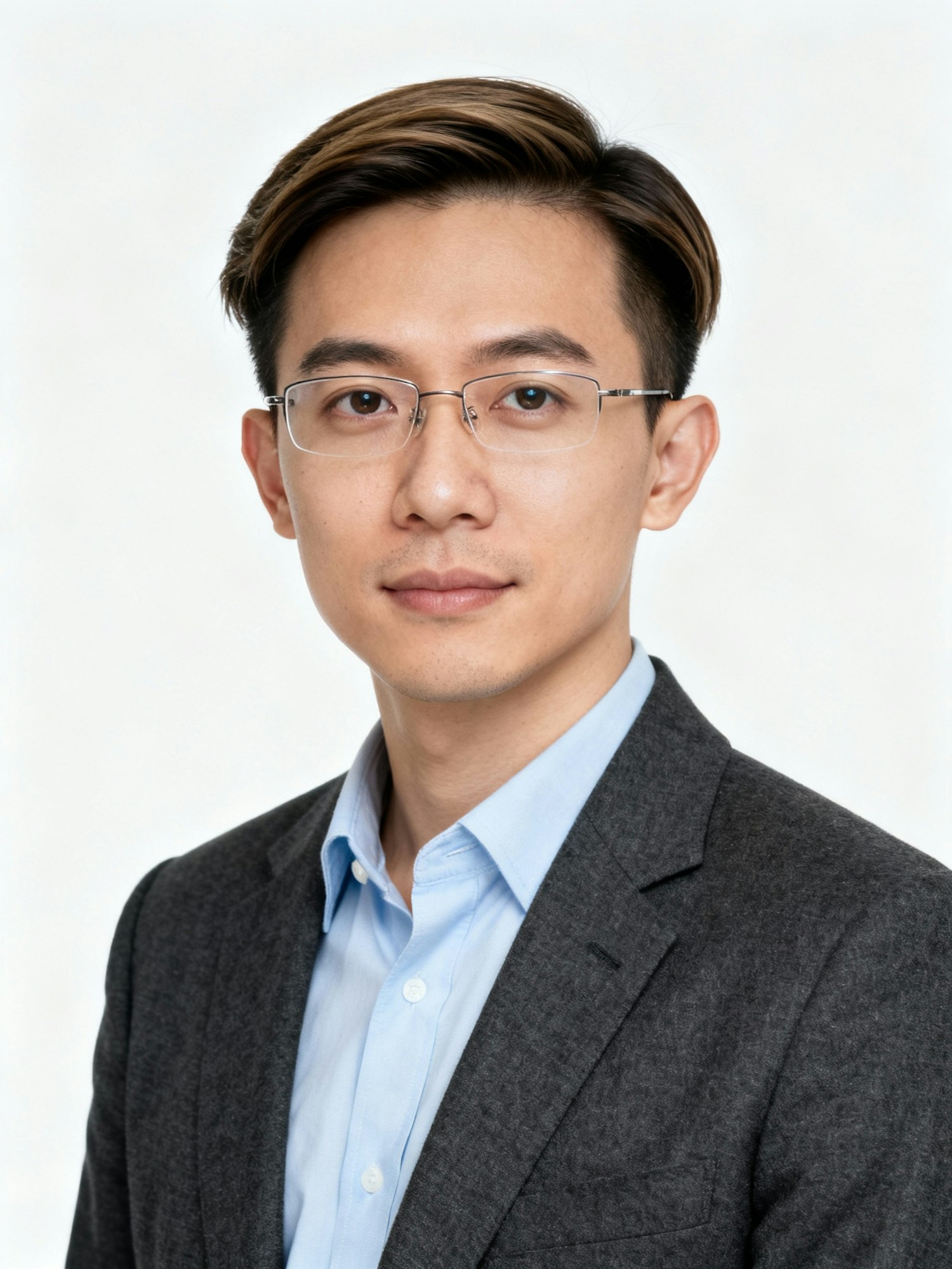 Studio portrait of a Singaporean Chinese man investment analyst, 30; light skin (neutral); neat side sweep; clean shave; charcoal blazer over pale-blue oxford; rimless glasses. Composition: three-quarter H&S (~10°), eyes to camera. Framing: head entirely visible; 8–12% headroom; mid-sternum crop; ears inside frame; centered; 3:4 vertical; slight pullback. Backdrop: pure white seamless. Lighting: high-key with soft Rembrandt; catchlights crisp; no color cast. Optics: 105 mm macro-sharp; exposure matched. Expression: attentive, measured. Negative: chart overlays, vignette, heavy retouch, tight top crop.