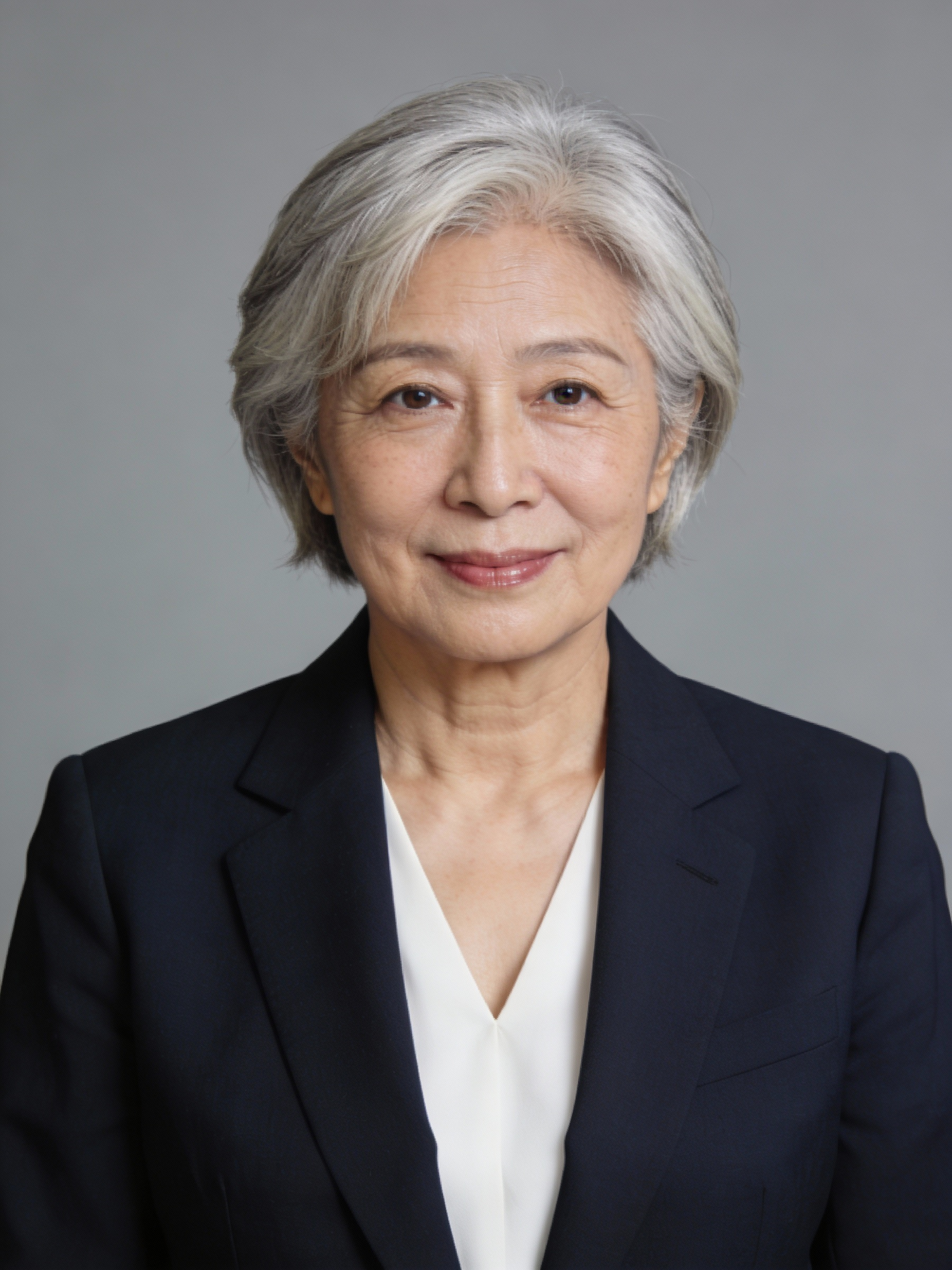 Professional portrait of an older individual with gray hair, wearing a navy blazer and white blouse, against a neutral gray background.
