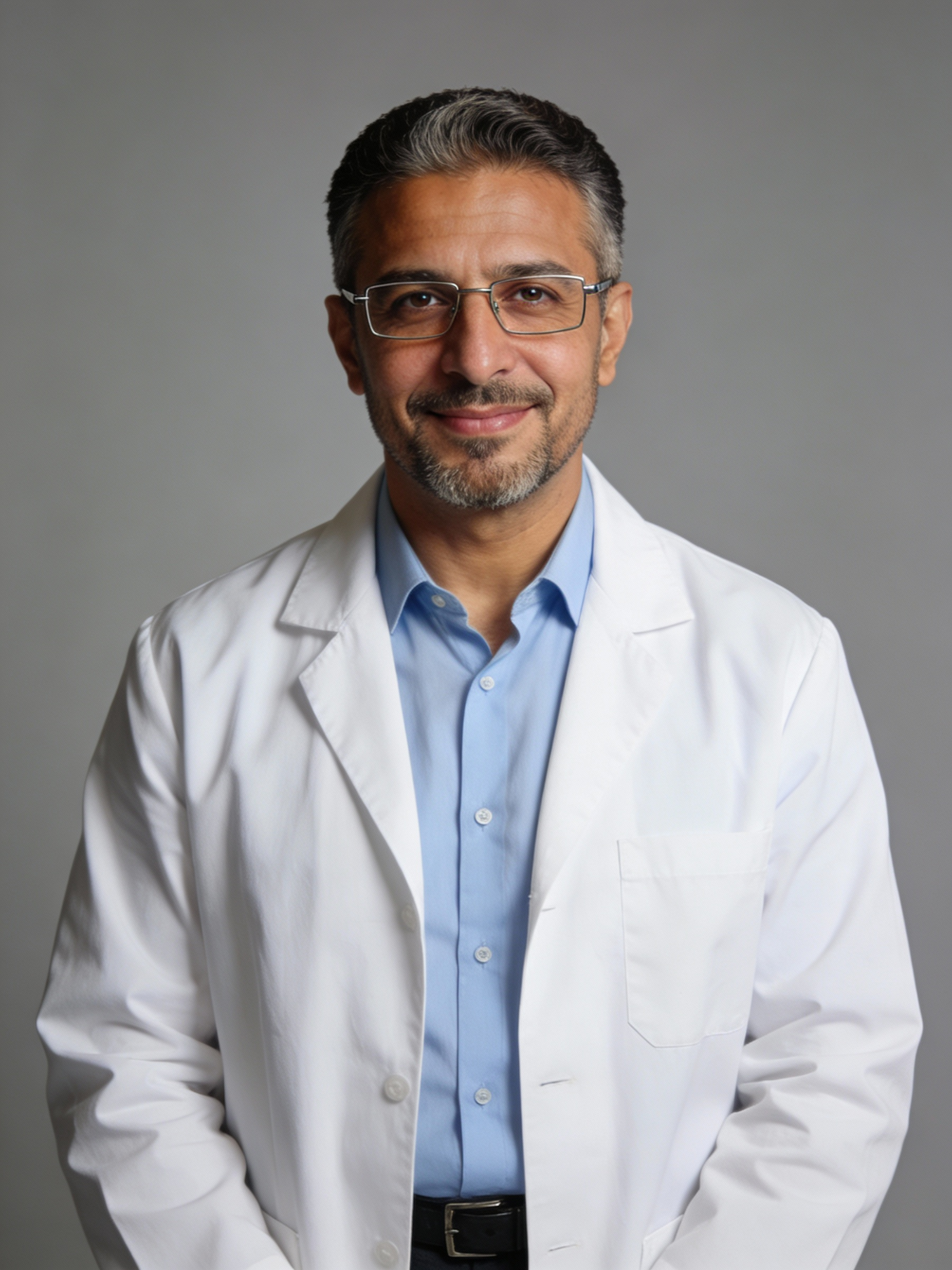 A professional man in a white lab coat and glasses smiles warmly against a neutral background, exuding confidence and expertise.