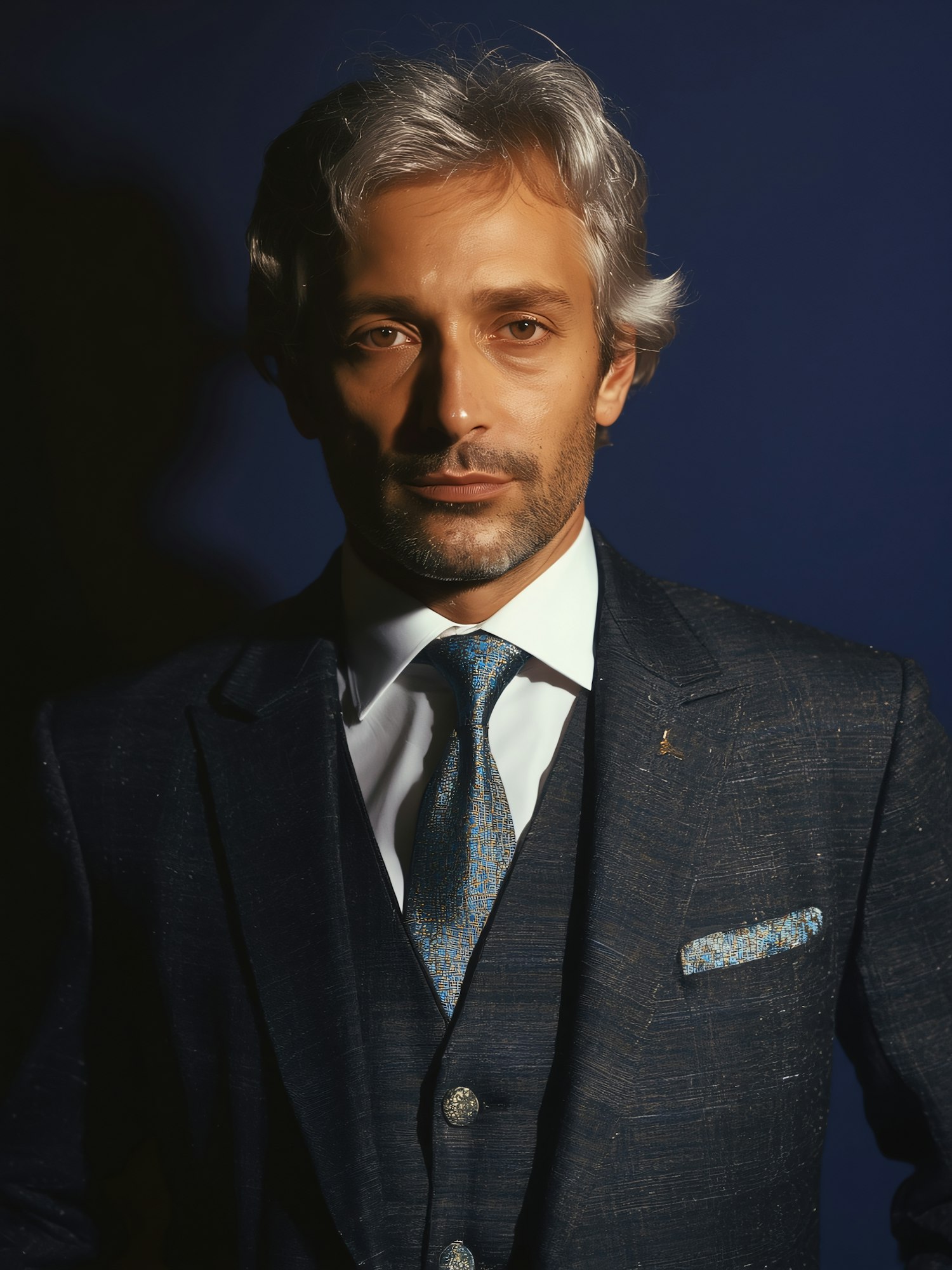 A man in a textured dark blue suit and patterned tie stands against a solid blue background, exuding a professional and polished look.