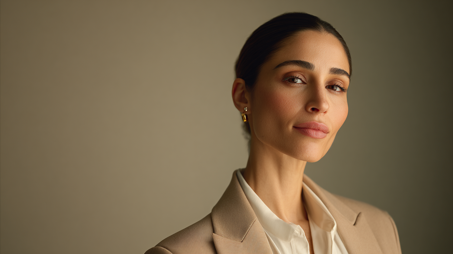 A professional portrait of a confident woman in a beige blazer and white blouse, set against a neutral background.