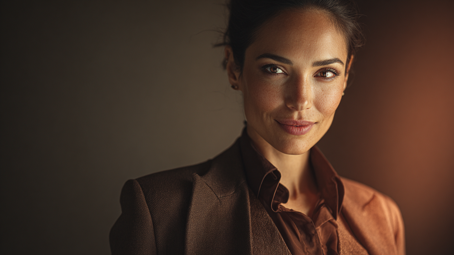 A professional portrait of a woman in a brown blazer, with warm lighting and a confident expression.
