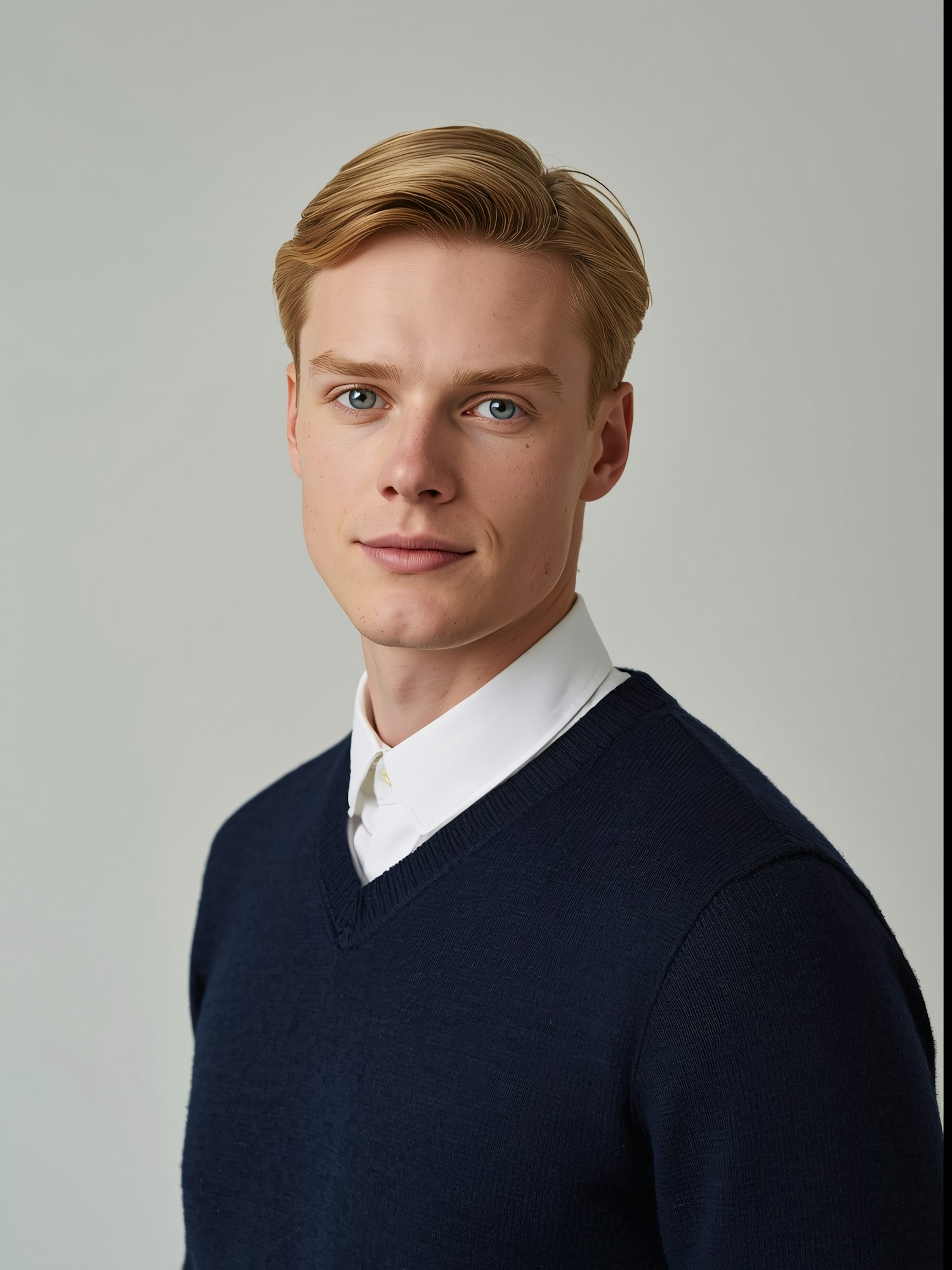 Professional portrait of a young man in a navy sweater and white shirt, set against a neutral gray background.