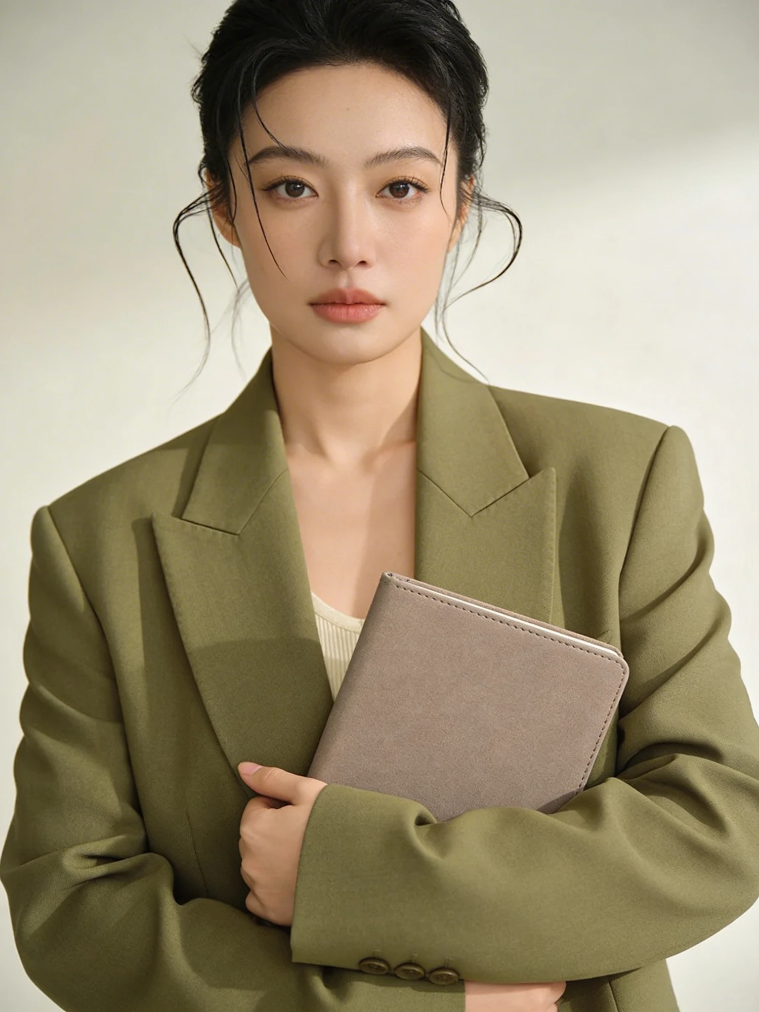 A woman in a green blazer holding a beige notebook, looking composed against a softly lit background.