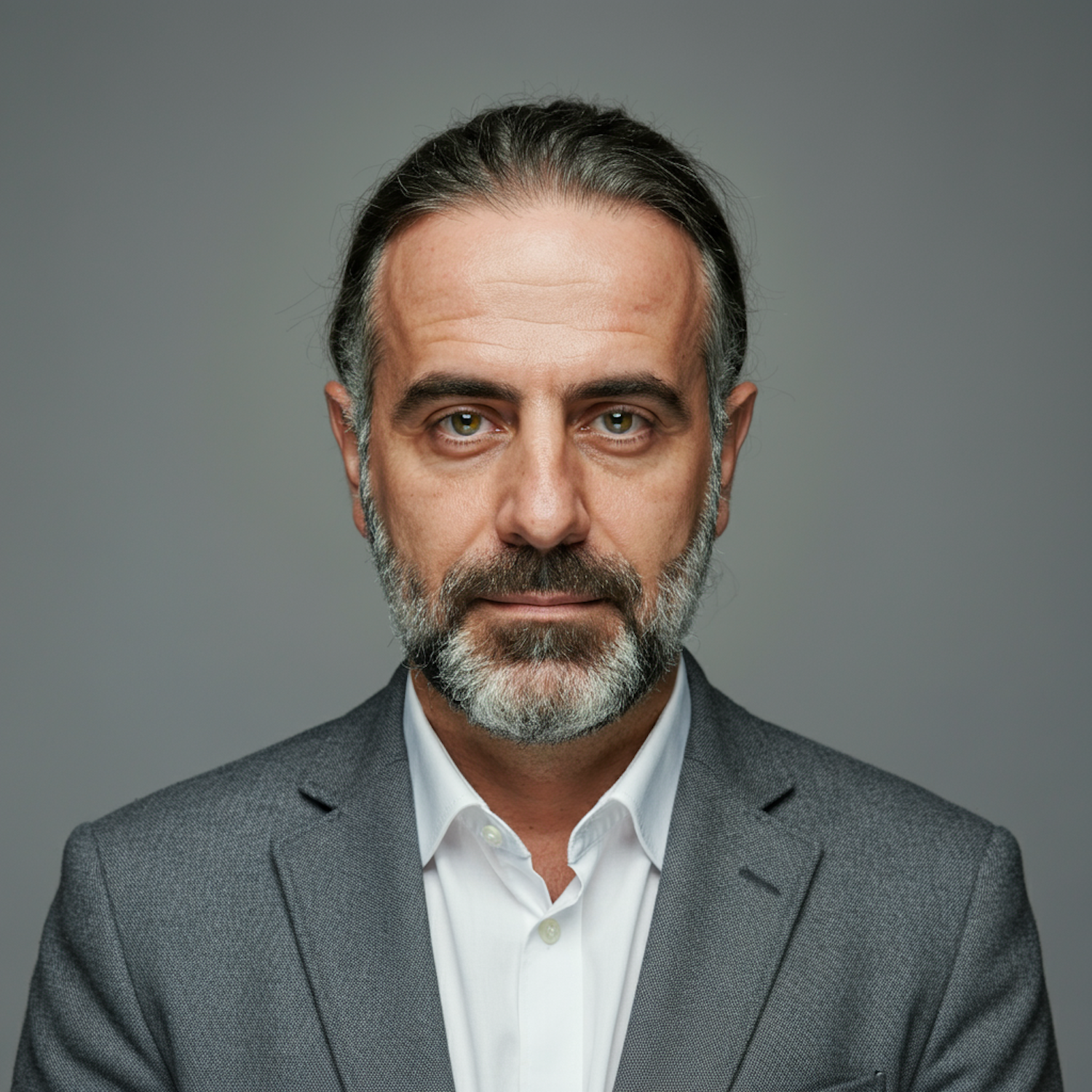 Professional portrait of a man with a salt-and-pepper beard, tied-back hair, and a gray suit against a neutral background.