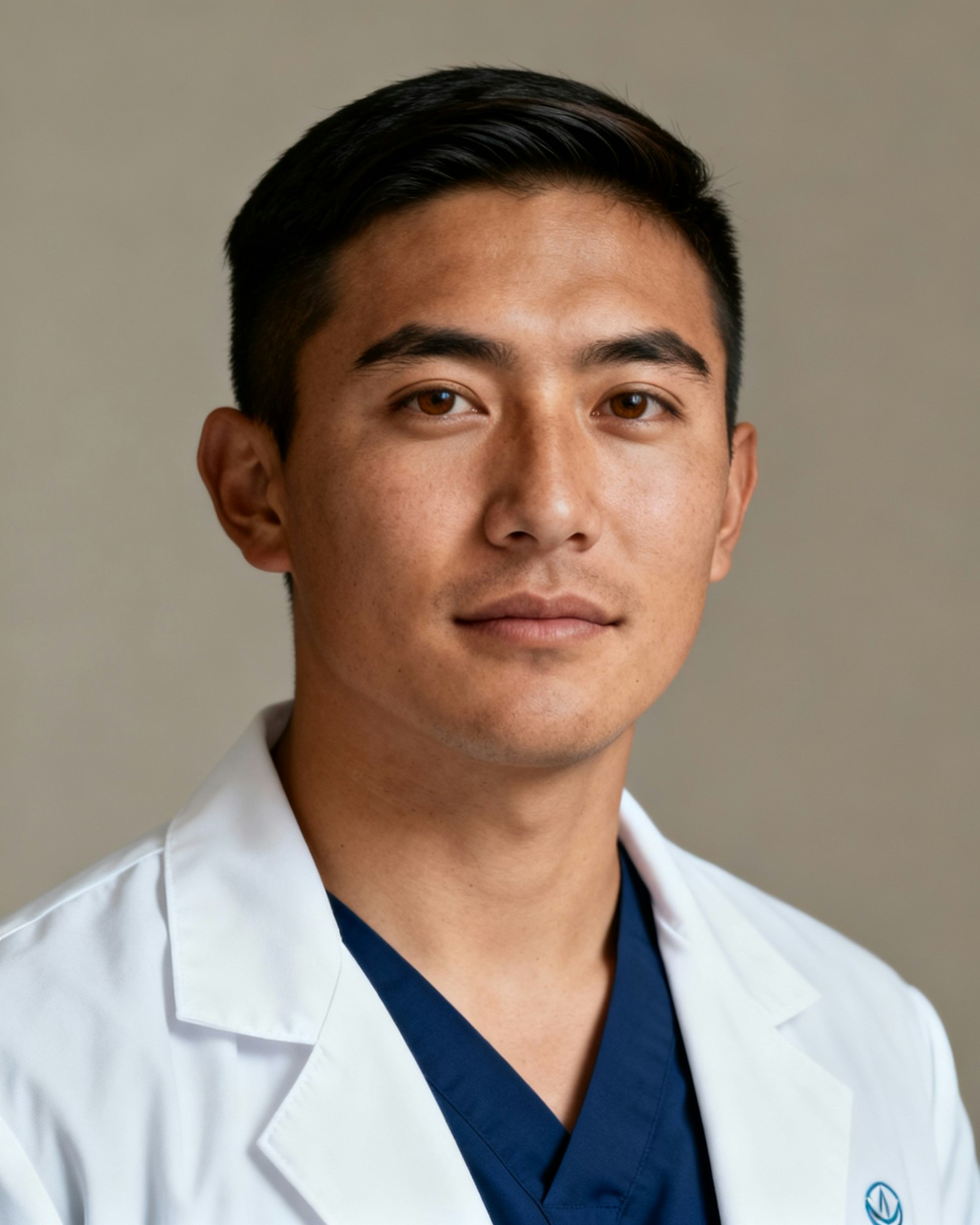 Studio portrait of a Yupik male dentist in his thirties; medium-light skin, cool undertone; short dark hair; softly arched brows; brown eyes; white coat over navy scrubs; framing: no crown crop—entire head visible; neutral seamless; Rembrandt lighting; 105mm macro-sharp; photorealistic. Expression: quiet confidence. Negative: over-whitened sclera, logos, head crop.