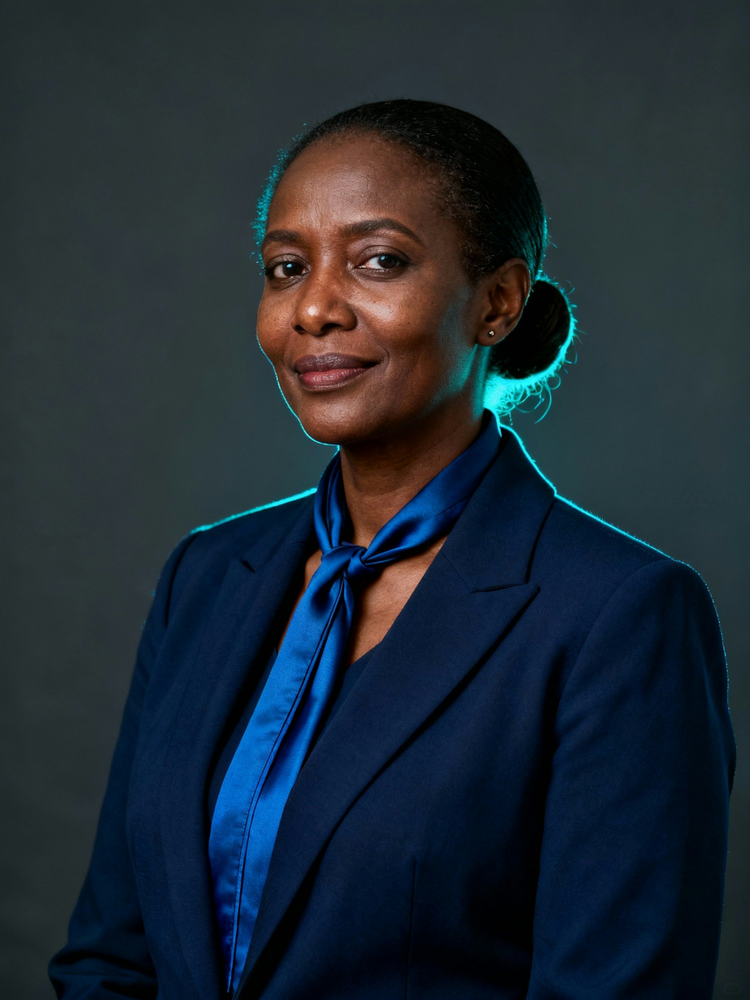 Studio portrait of a woman tech entrepreneur from Niger (Tuareg heritage) in her forties; deep brown skin, cool; neat low bun; midnight blazer with a narrow indigo silk accent scarf. Backdrop: charcoal seamless. Lighting: Rembrandt key 5600 K + cyan gel rim ~12%; subtle hair light. Lens/Quality: 105 mm macro-sharp; studio-grade clarity; texture retained. Expression: measured confidence. Negative: heavy texture removal, oversaturation, logos, watermarks.