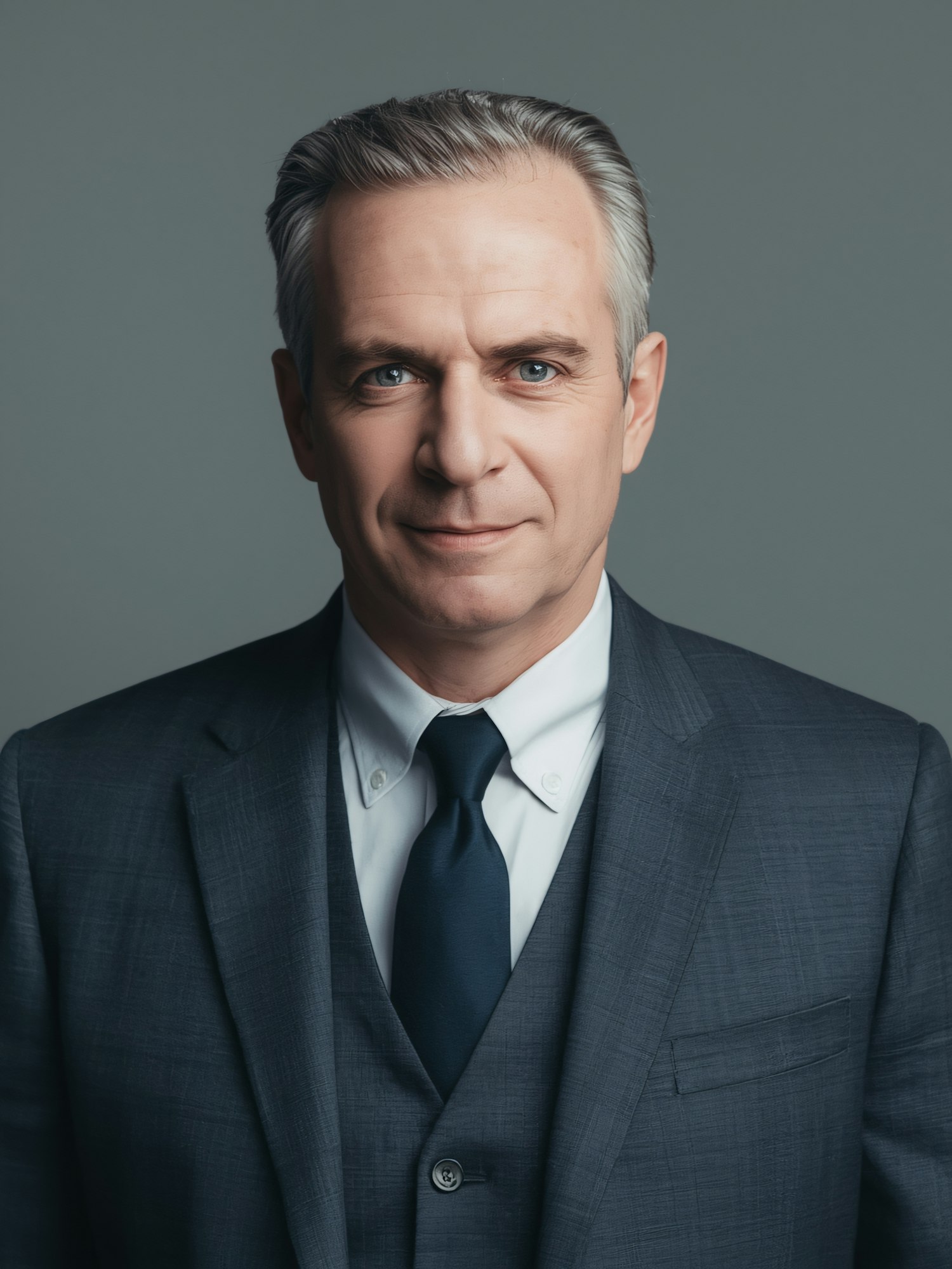 A professional portrait of a middle-aged man in a gray suit, white shirt, and navy tie, set against a neutral gray background.