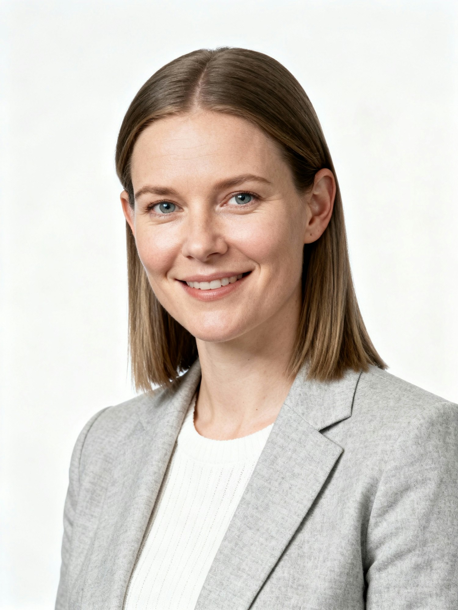 Studio portrait of a Norwegian woman climate policy analyst, 32; fair skin (cool); straight shoulder-length hair, center part; minimal makeup; light-gray blazer over white knit. Composition: three-quarter H&S (~10°), eyes to camera. Framing: full head visible; 8–12% headroom; crop at upper chest; ears in frame; centered; 3:4 vertical; slight pullback; no auto-zoom. Backdrop: pure white seamless. Lighting: bright high-key, soft Rembrandt; even fill; clean catchlights. Optics: 105 mm macro-sharp; neutral WB; consistent exposure. Expression: clear, focused half-smile. Negative: leaf/eco icon overlays, tinted color wash, heavy retouch, head clipped.