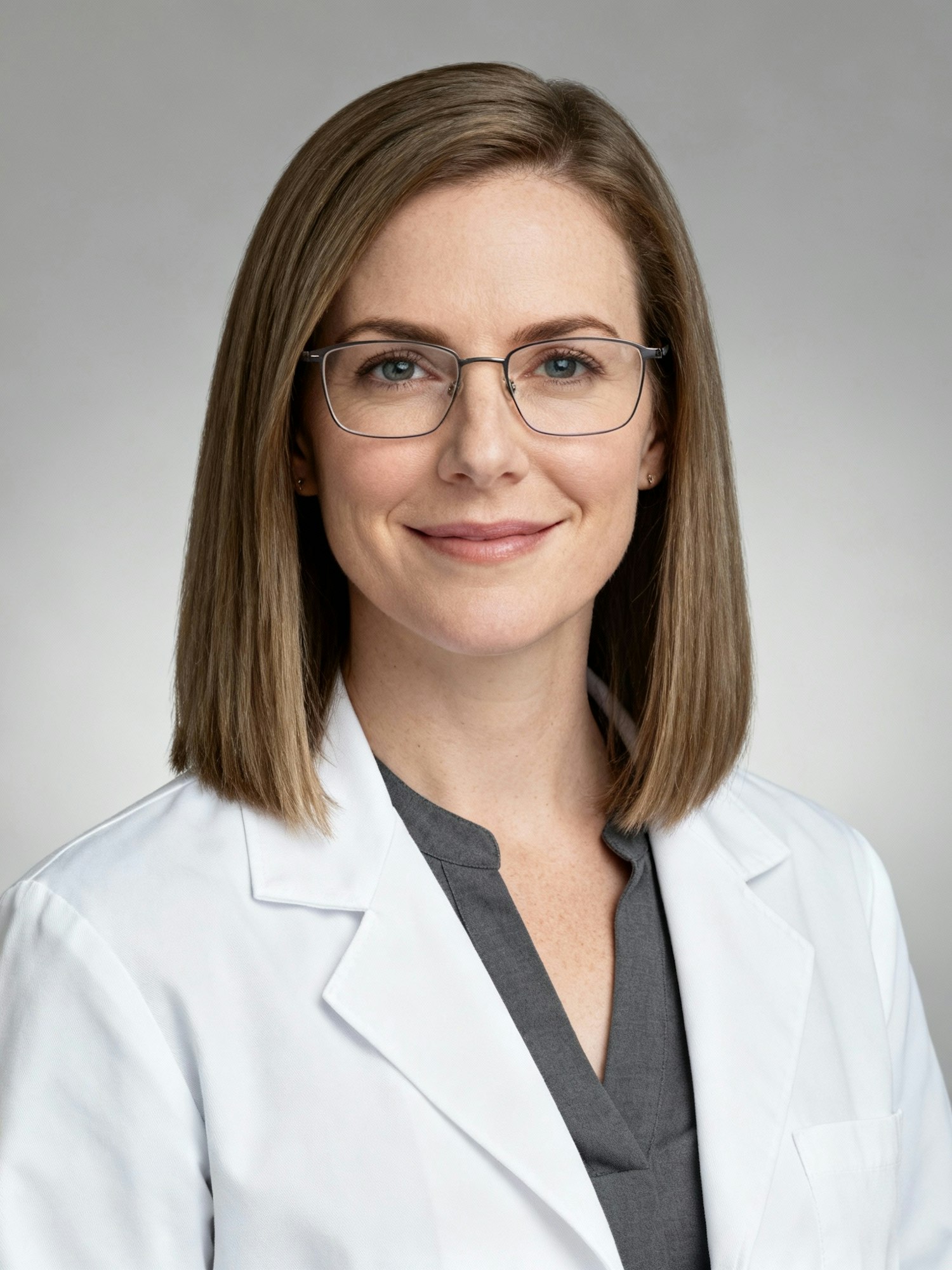 Professional portrait of a woman in a white lab coat and glasses, exuding confidence and expertise in a neutral setting.