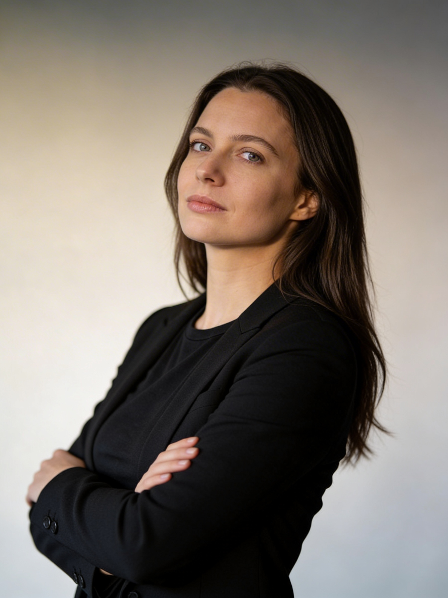 Professional portrait of a woman in a black blazer, standing confidently with arms crossed against a gradient background.
