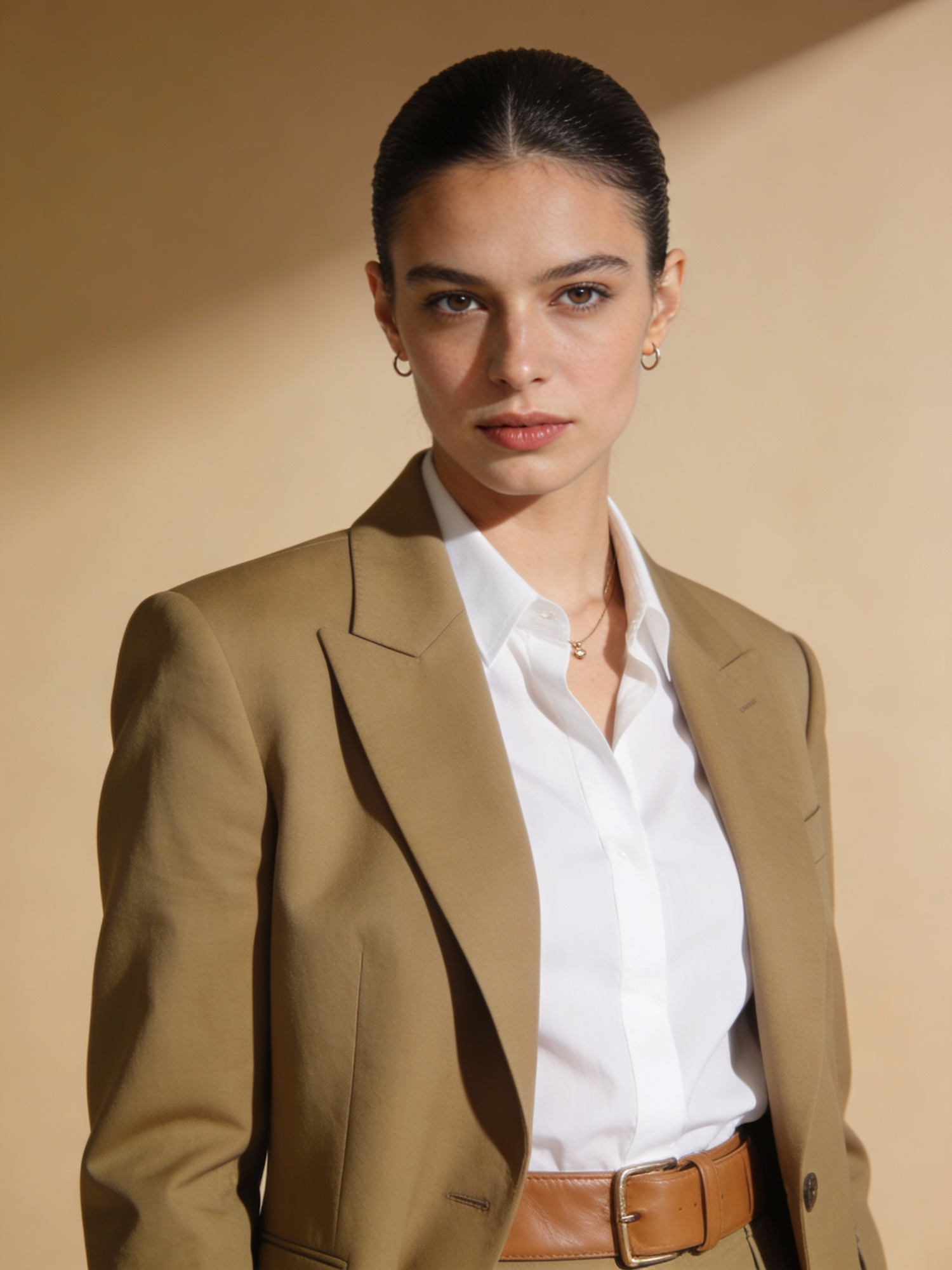 Editorial fashion portrait cropped from shoulders to waist of a woman model wearing a structured khaki blazer over a crisp white shirt, camel leather belt detail visible, minimal jewelry, slicked-back hair, confident neutral expression, warm sand studio background, precise directional lighting emphasizing tailoring — ultra-HD 4K fashion editorial photography, razor-sharp focus, extreme detail, modern luxury styling, clean composition, high dynamic range, crisp textures, premium magazine quality, contemporary fashion aesthetic, no grain, no blur, no vintage