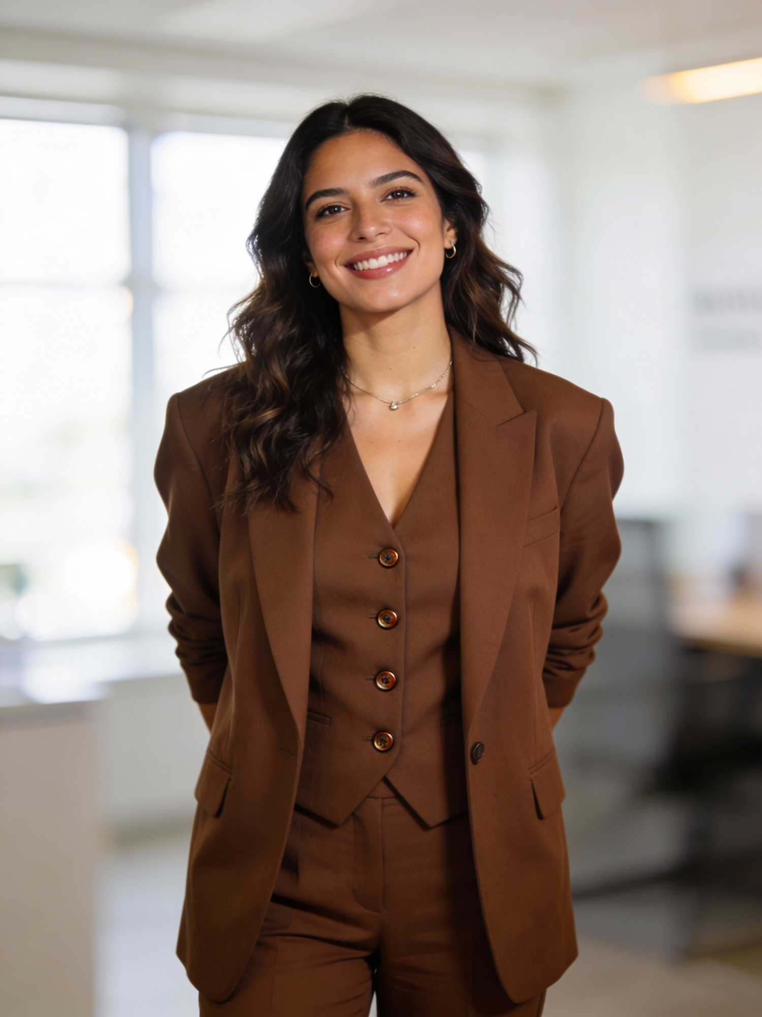 Ultra-realistic professional portrait of a confident Mexican woman, early 30s. Outfit: chocolate-brown oversized blazer over matching buttoned vest (visible buttons), matching trousers implied; minimal jewelry. Hair: wavy loose worn down. Framing: tight head-and-shoulders, centered, eye-level. Pose: shoulders open with arms positioned behind her back (hands not visible), posture upright, chin slightly lifted. Expression: warm confident smile—composed, approachable, strong. Eye contact: direct to camera with clean catchlights. Background: bright modern office with soft bokeh, strongly blurred. Lighting: soft window daylight + gentle fill + subtle rim, premium corporate/editorial retouch. 85mm look, shallow DOF, clean neutral warm grade. No props, no readable text, no logos, no watermark.