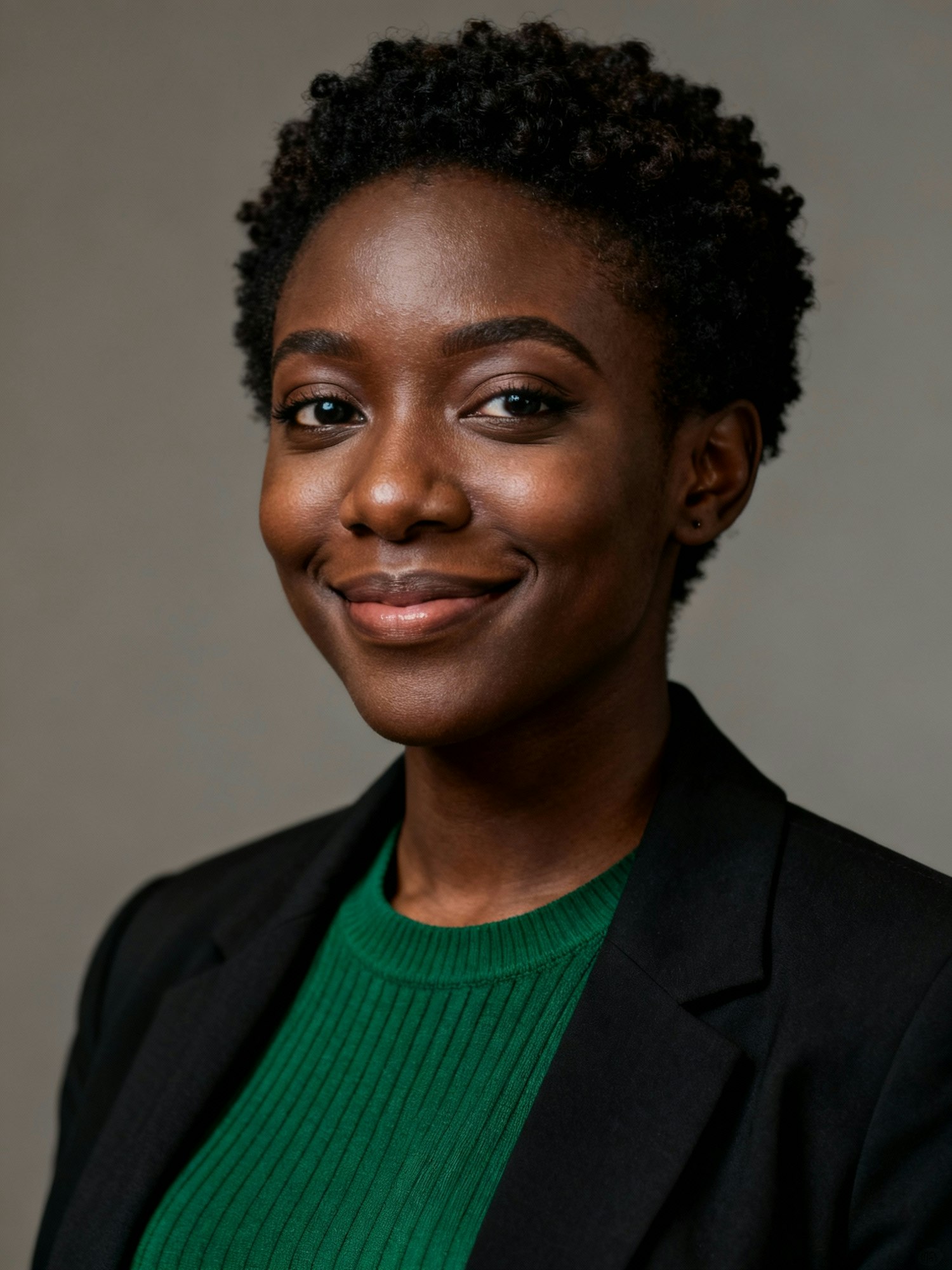 Studio portrait of a Nigerian woman software engineer, age 29; deep brown skin, cool; short natural curls; emerald crew knit under black blazer; neutral seamless; Rembrandt lighting; 105mm macro-sharp; photorealistic. Expression: approachable professionalism, small smile. Skin: natural, lightly smoothed. Negative: over-retouch, logos, watermarks.