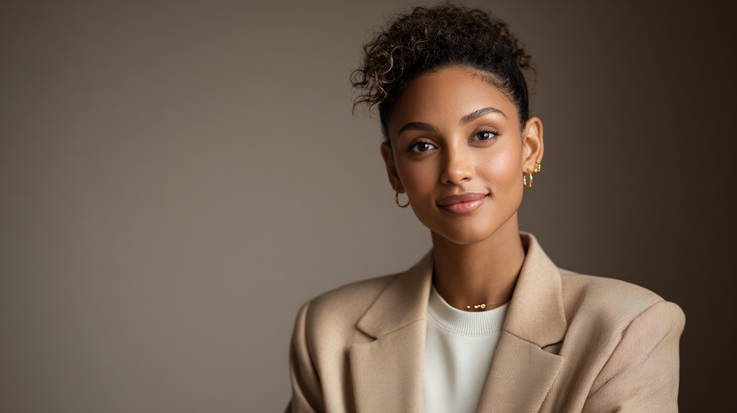 A professional portrait of a young woman with curly hair, wearing a beige blazer and gold accessories, set against a neutral background.