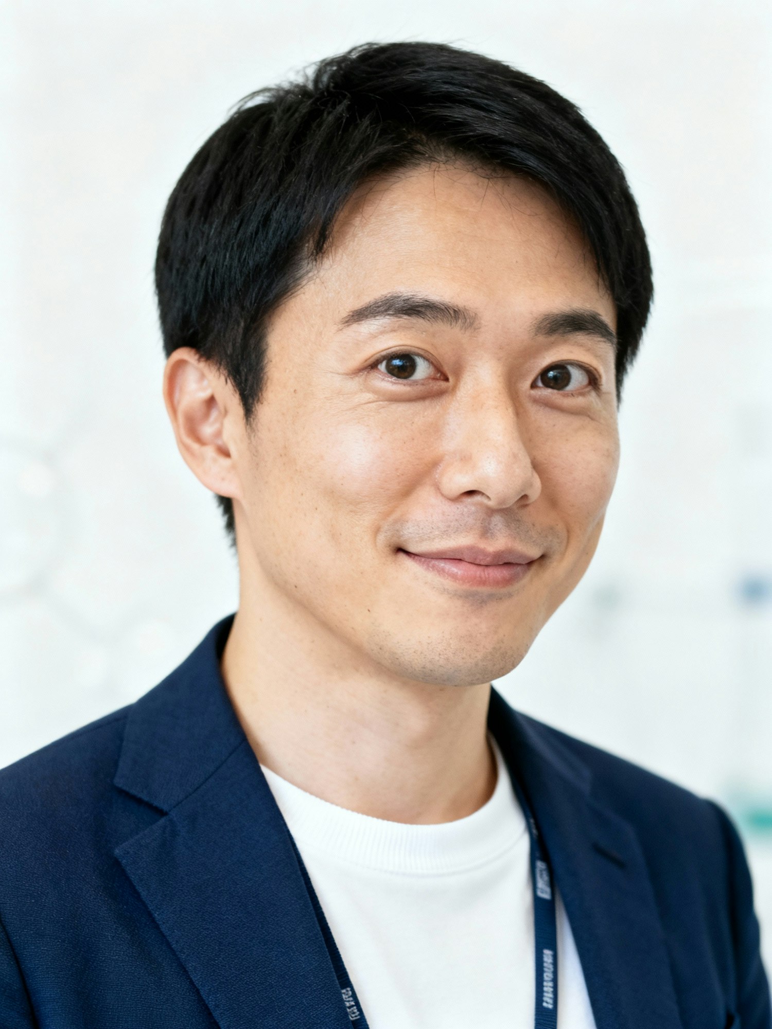 Studio portrait of a Japanese man research PI, 38; light skin (neutral); neat short hair; navy blazer over white crew; matte ID lanyard edge barely visible. Same white seamless + high-key soft Rembrandt + 105 mm. Expression: inquisitive, modest smile. Negative: lab goggles, molecule graphics, HDR shine.